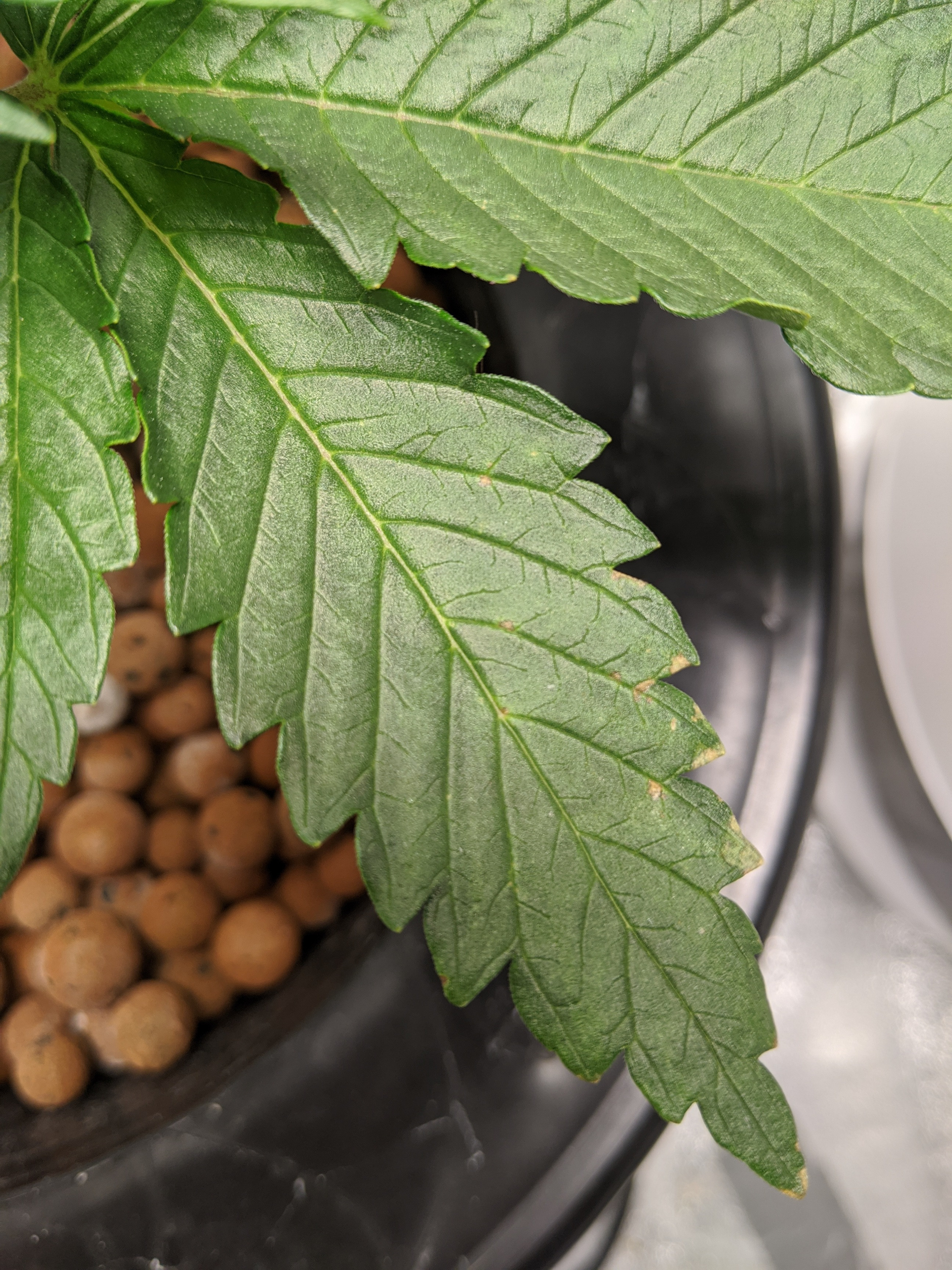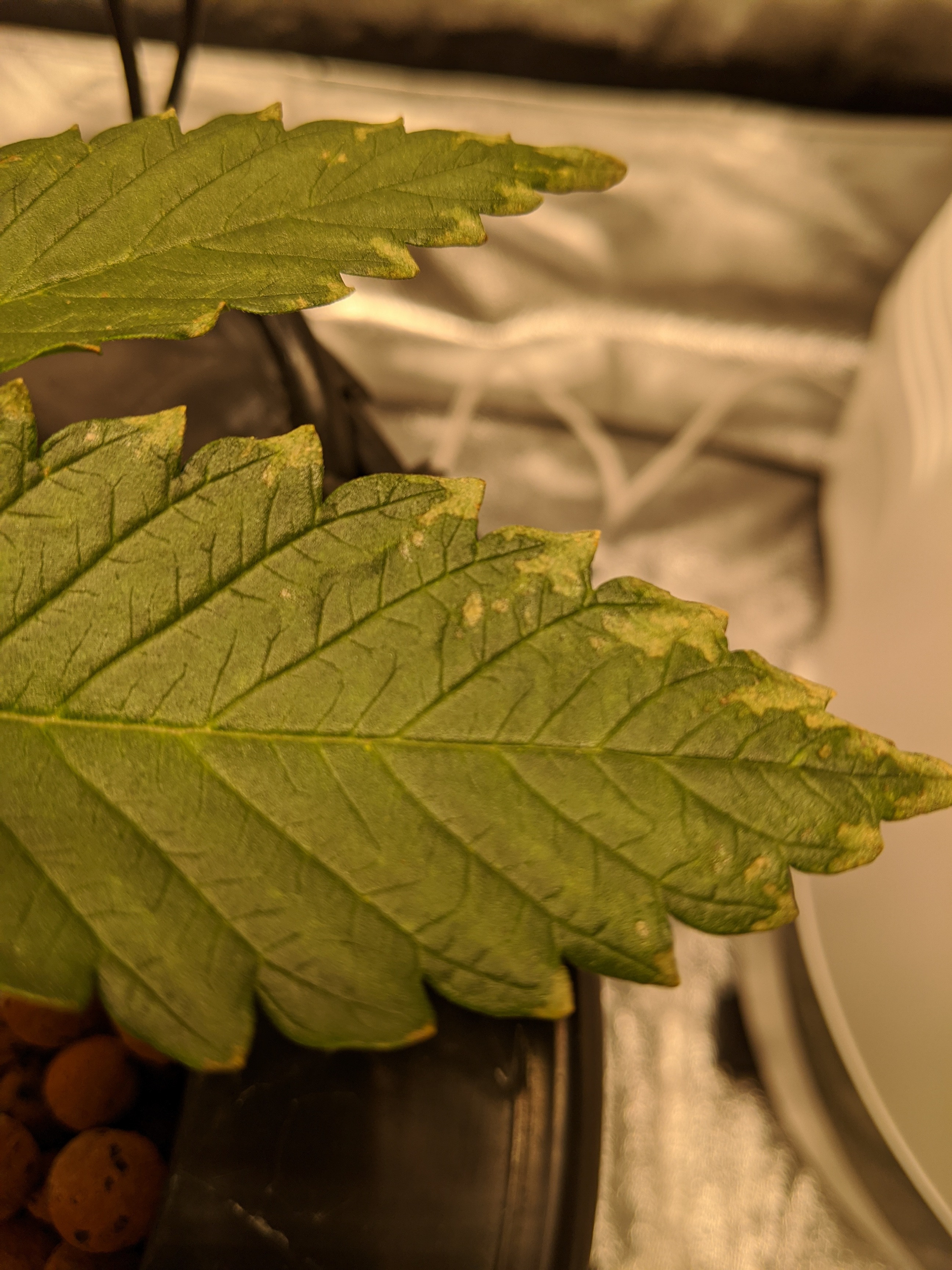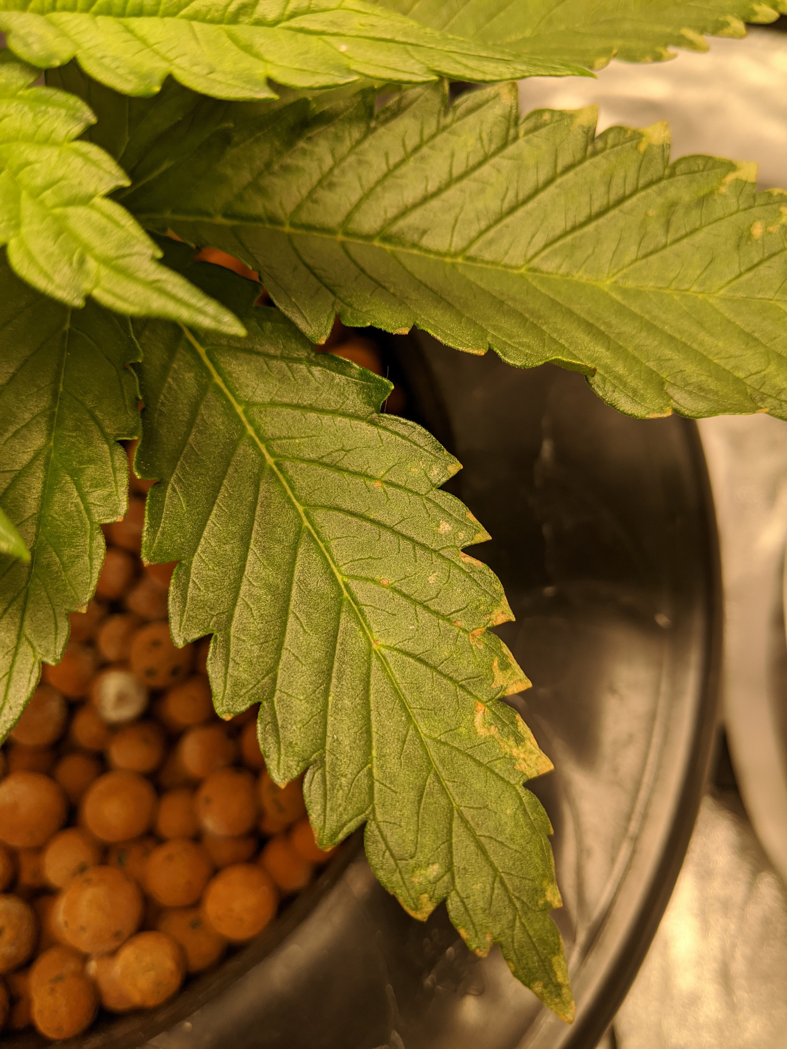 The spotting appears to be getting worse, but is mostly contained to two of the older fan leaves. I picked up some GH CALiMAGic and added a little over a teaspoon (around a half dosage for veg). New photos attached.