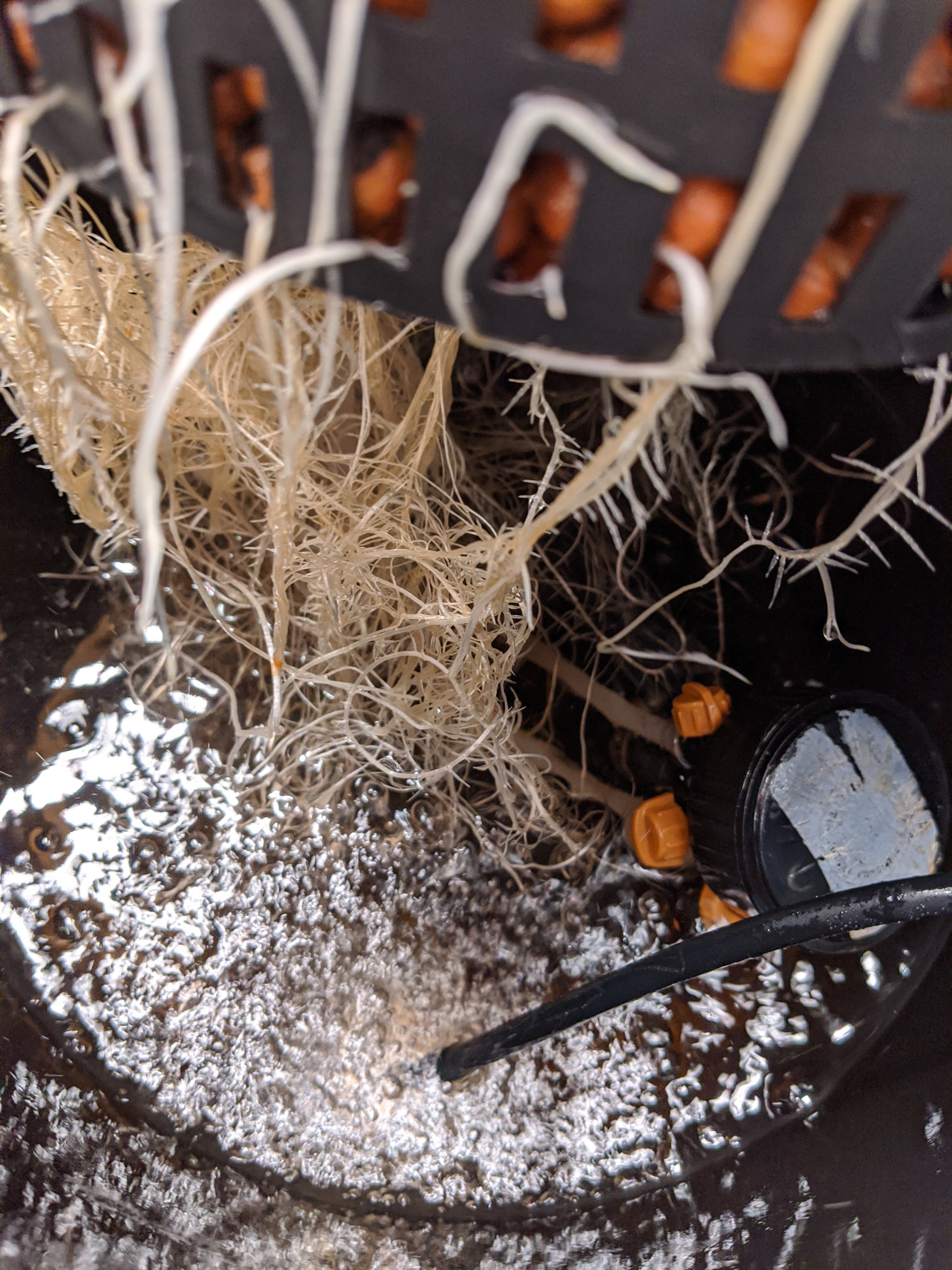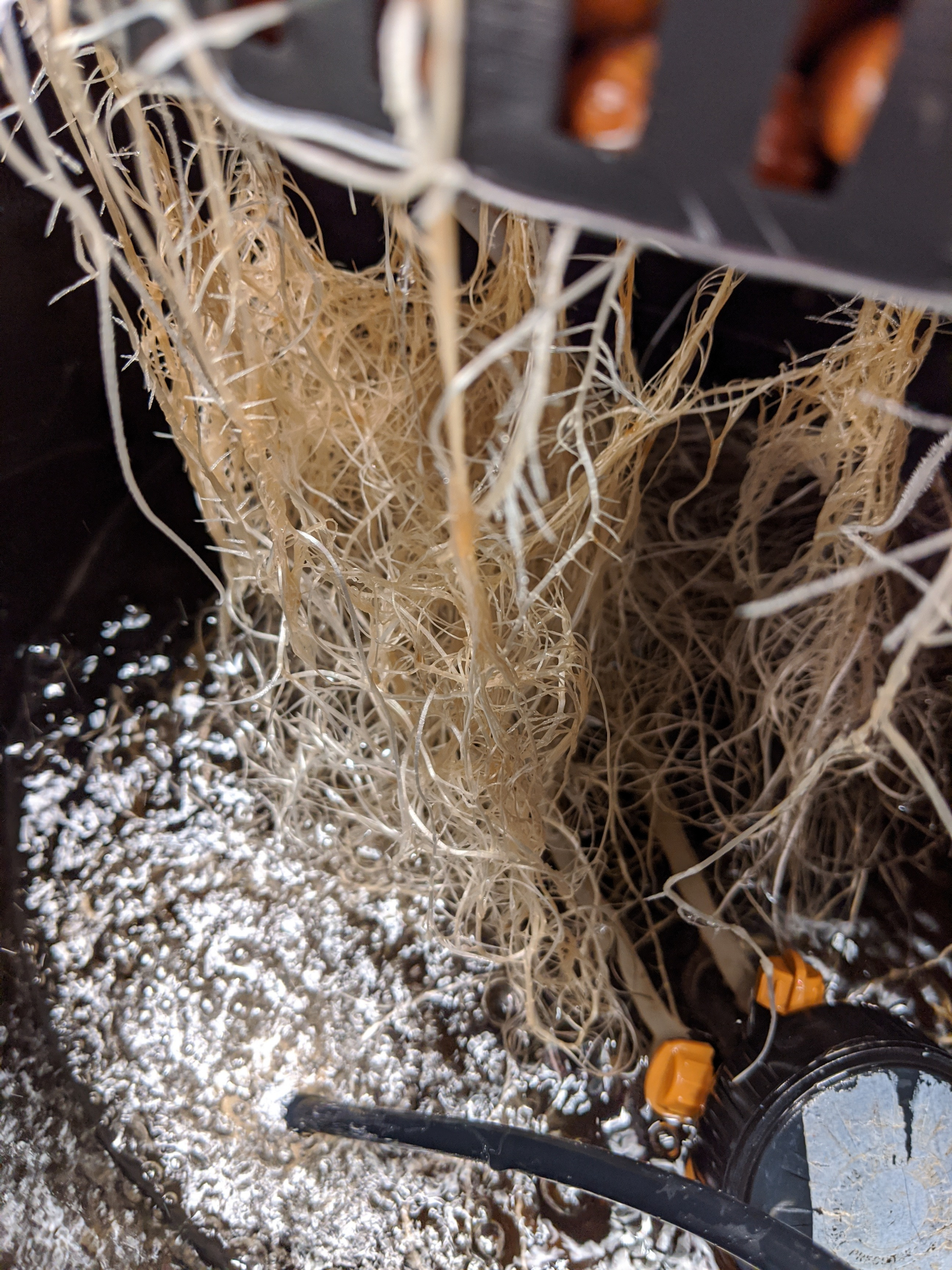 I decided to swap the water a bit early, some of the old fan leaves are starting to show some spotting. I'm using the same amount of nute, 2.5ml per gallon of the GH trio, with 2ml per gallon of hydroguard, some BioRoot and Mr Fulvic as well, PH to 6.0-6.1. I checked the PH of the previous grow water and it read at 5.6-5.7, which is lower than I like it. Photos of the spots and roots attached.