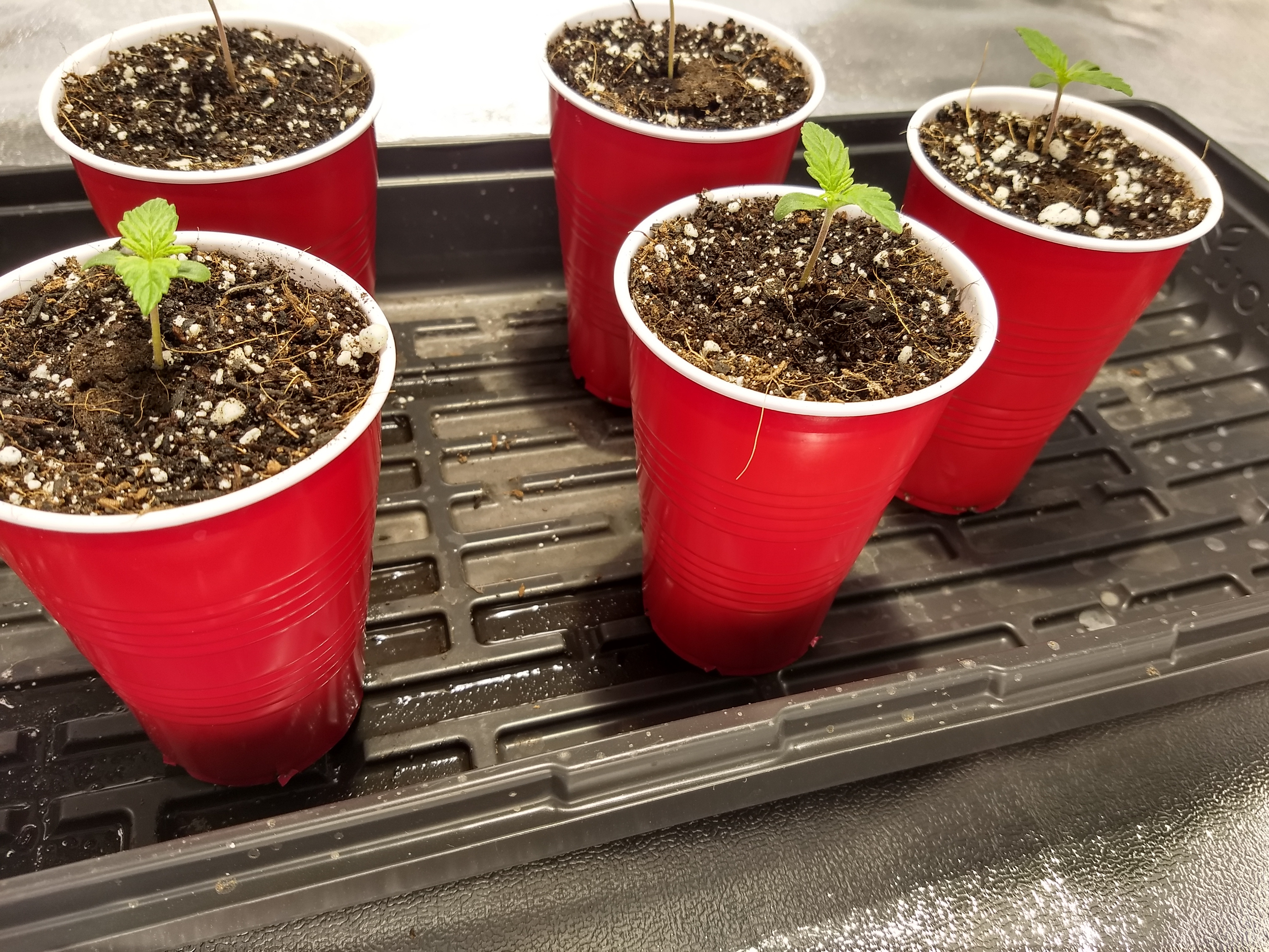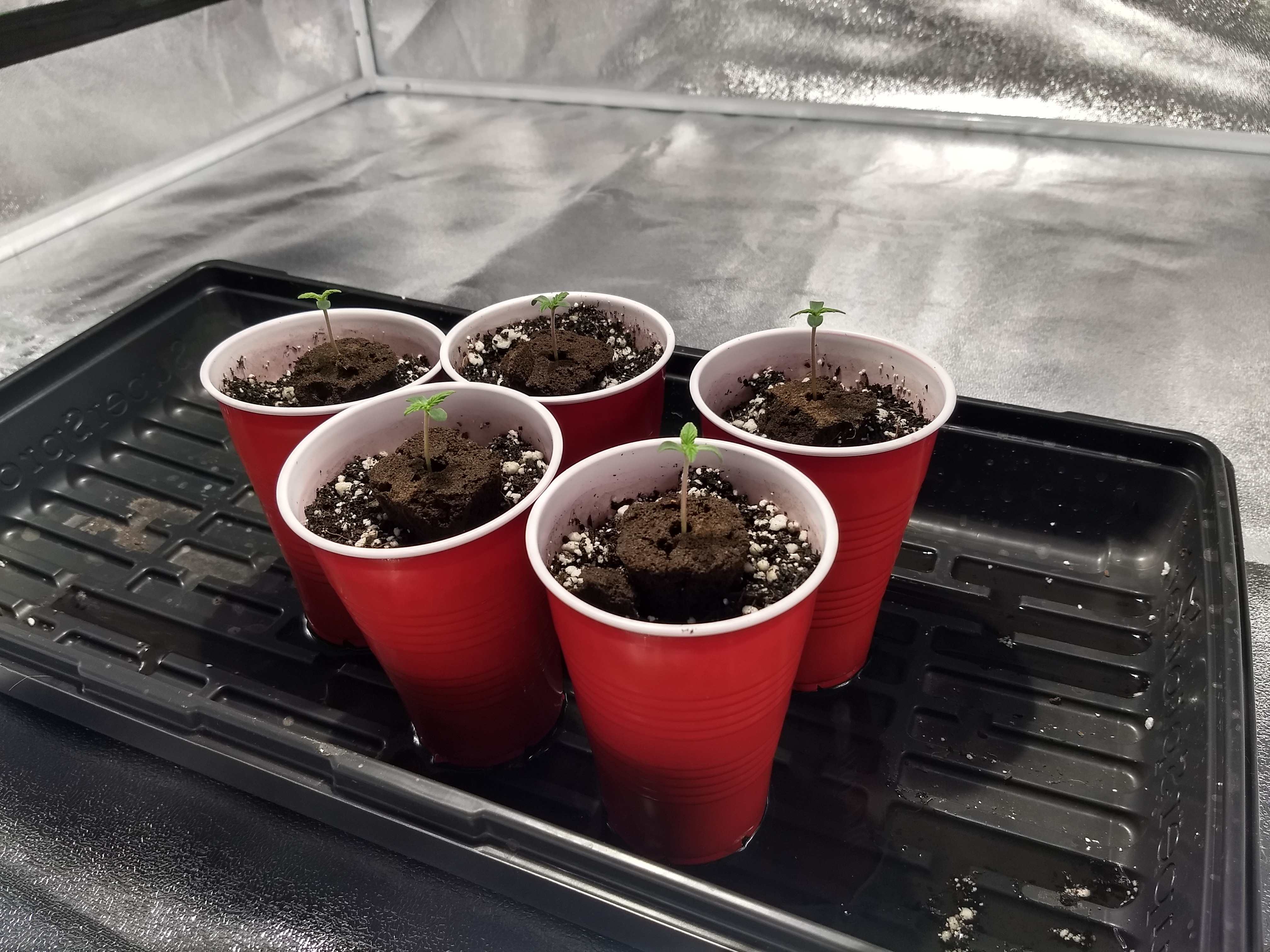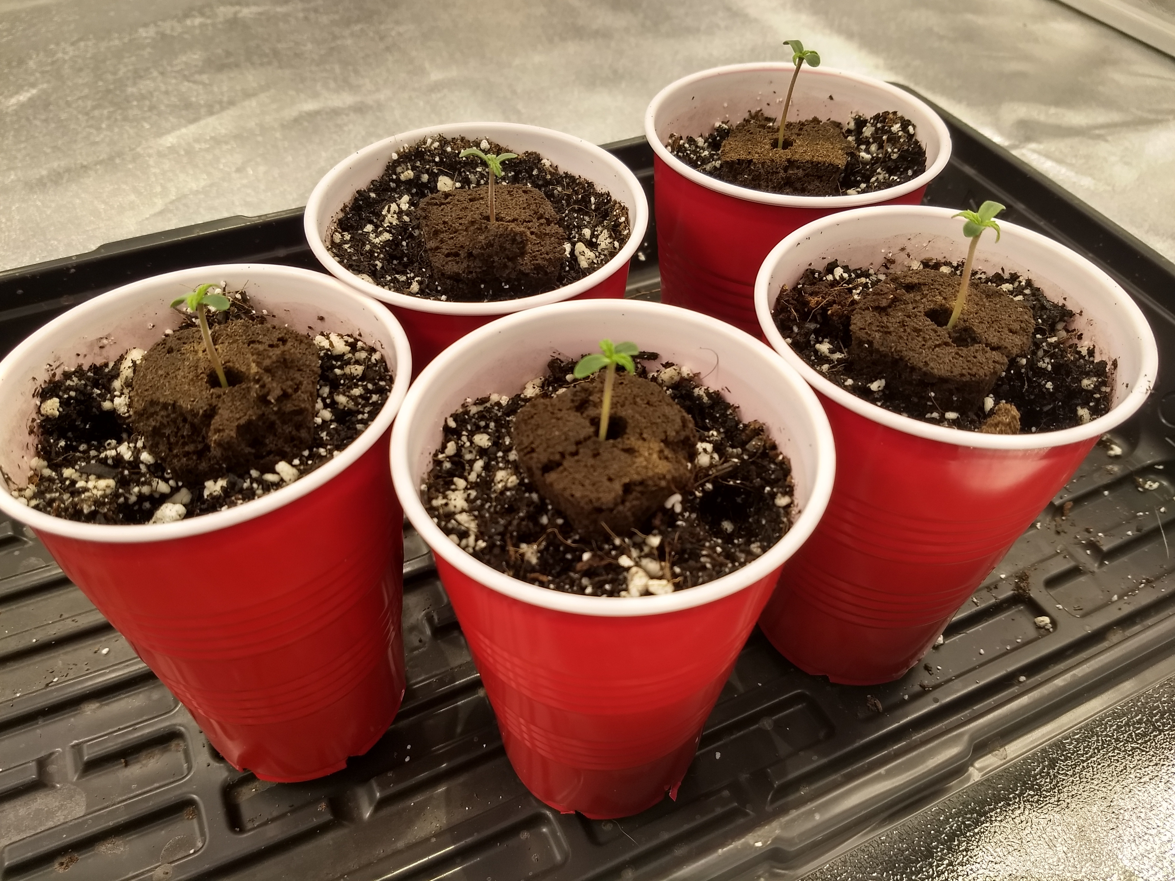 Gave them soft LED lighting for a couple days before I put them in coco, in solo cups, with 1/4 strength nutes (Cal-mag & Canna Coco A&B) on 3/12/20, and put them under the 315CMH.