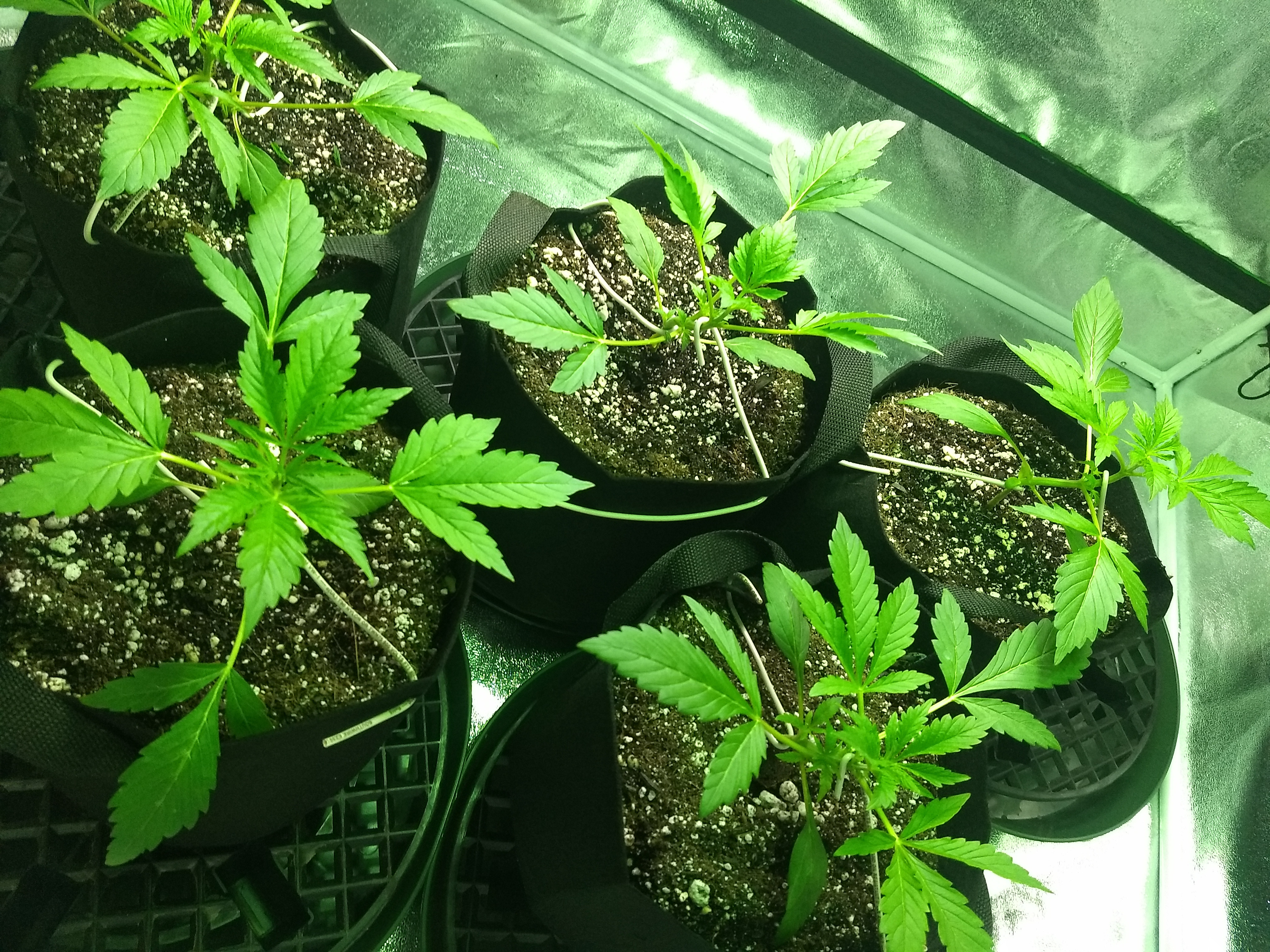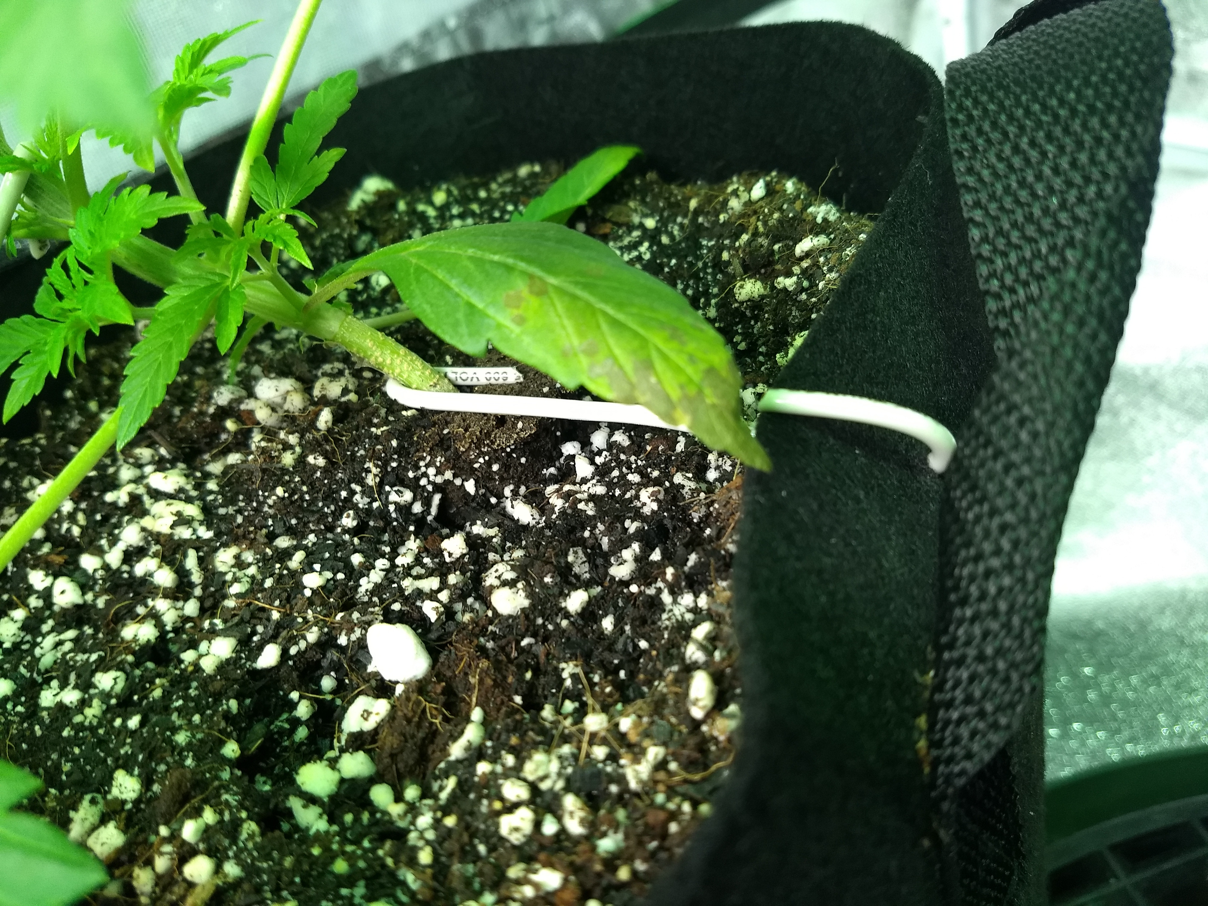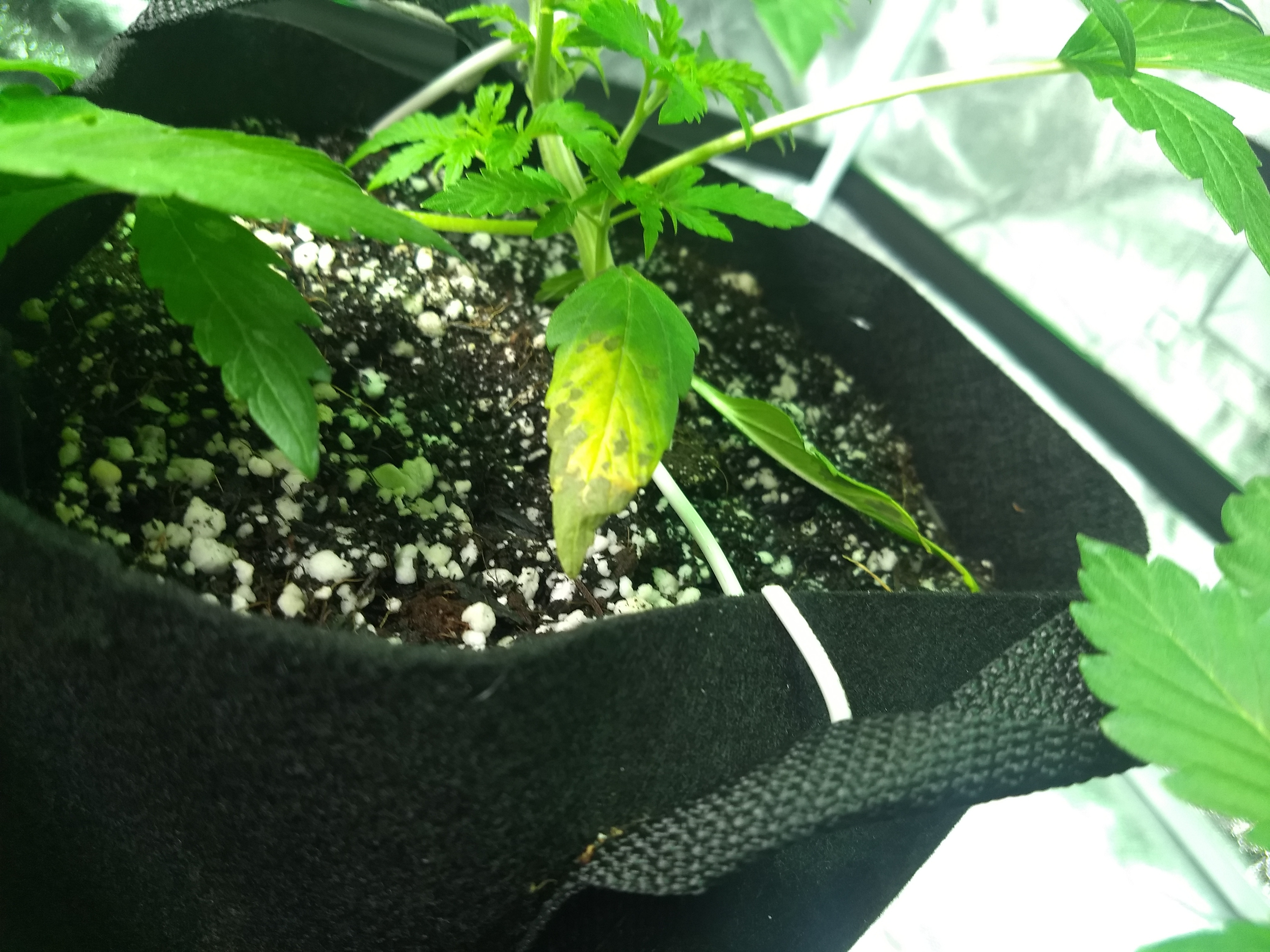 One plant starting to concern me. Yesterday morning one of the lower leaves had a little brown on it and now it's turning yellow. Only 1 of the 5 plants showing these symptoms, this makes me wonder if it's a root problem? They all get fed at the same time with the same water. They all get watered to runoff (quite a bit more than the 20% recommended) This plant was NOT fimmed, but is undergoing LST. It's in coco/perlite and gets fed ~half strength nutes (Canna Coco A&B) plus cal-mag every other day. Temp in the tent is between 70 and 75 and RH has been hovering around 60.