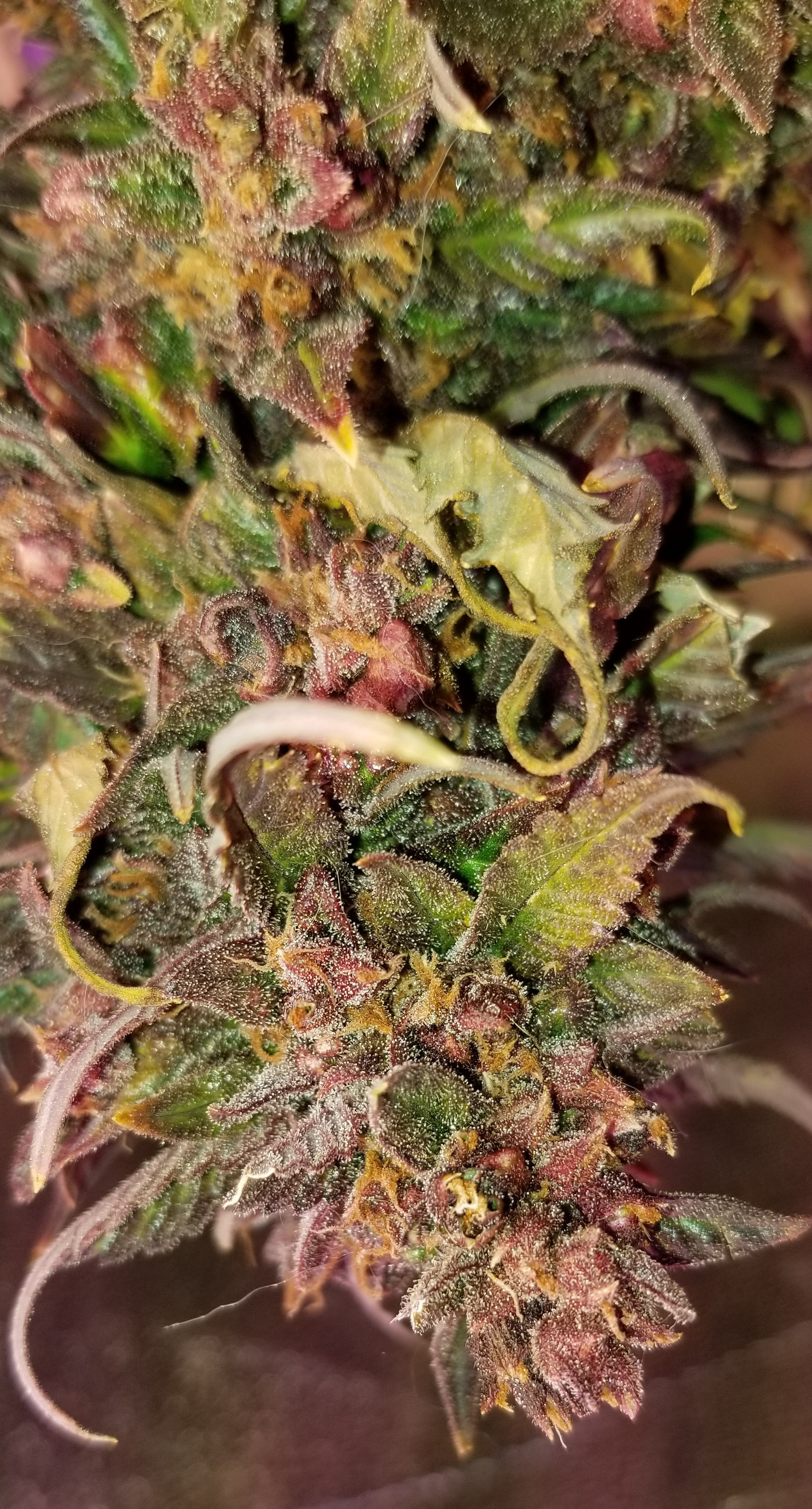 Lots of trichs but no amber. Not even much cloudiness. Kept checking every day. Now I have more leaves growing than anything else and these don't look like regular buds to me. I don't know what the plants are doing. They haven't been stressed, no problems with light or nute burn or drying out. All the pistils came out, turned amber, then died and dropped off. Some new white one are starting to appear in places but very sparse.