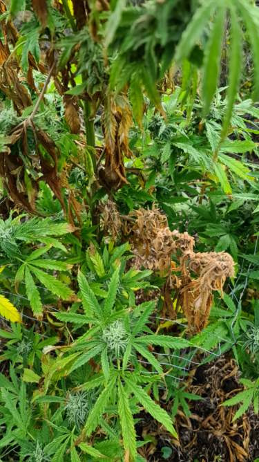 First thing I would do is remove all the dead. Looks to me like bud rot, Trifecta Crop Control is said to be safe to harvest but pricey. Air flow, reduced RH, thinning the under and inside of the plant, no leaf touching another, let the soil dry tween watering.