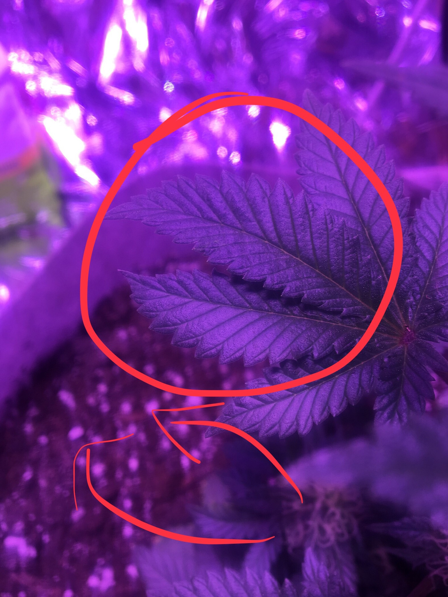 Hello and welcome to GWE. Looks like a tad bit of nute burn and splash on leaf during pour. Hard to see in that color of light though.