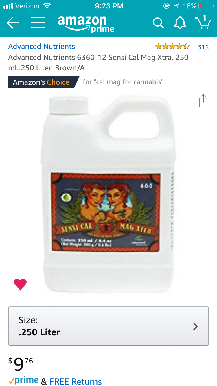 Issue: I see weird yellow marks on one of the leaves that concern me. It looked like a cal mag deficiency that happened to a previous plant, so I started by putting 2 ml of sensi seeds cal mag solution (pictured) into one gallon of Walmart distilled water and giving her half. The other half went to her sister. An Amazon question suggested 8 ml per gallon, but I decided to err on the side of caution. Not seeing improvements I gave her half of a water gallon filled with 8ml cal mag. No change thus far. This is the only nutrient she’s been receiving. Nutes are kinda confusing for me so I was really nervous about them.