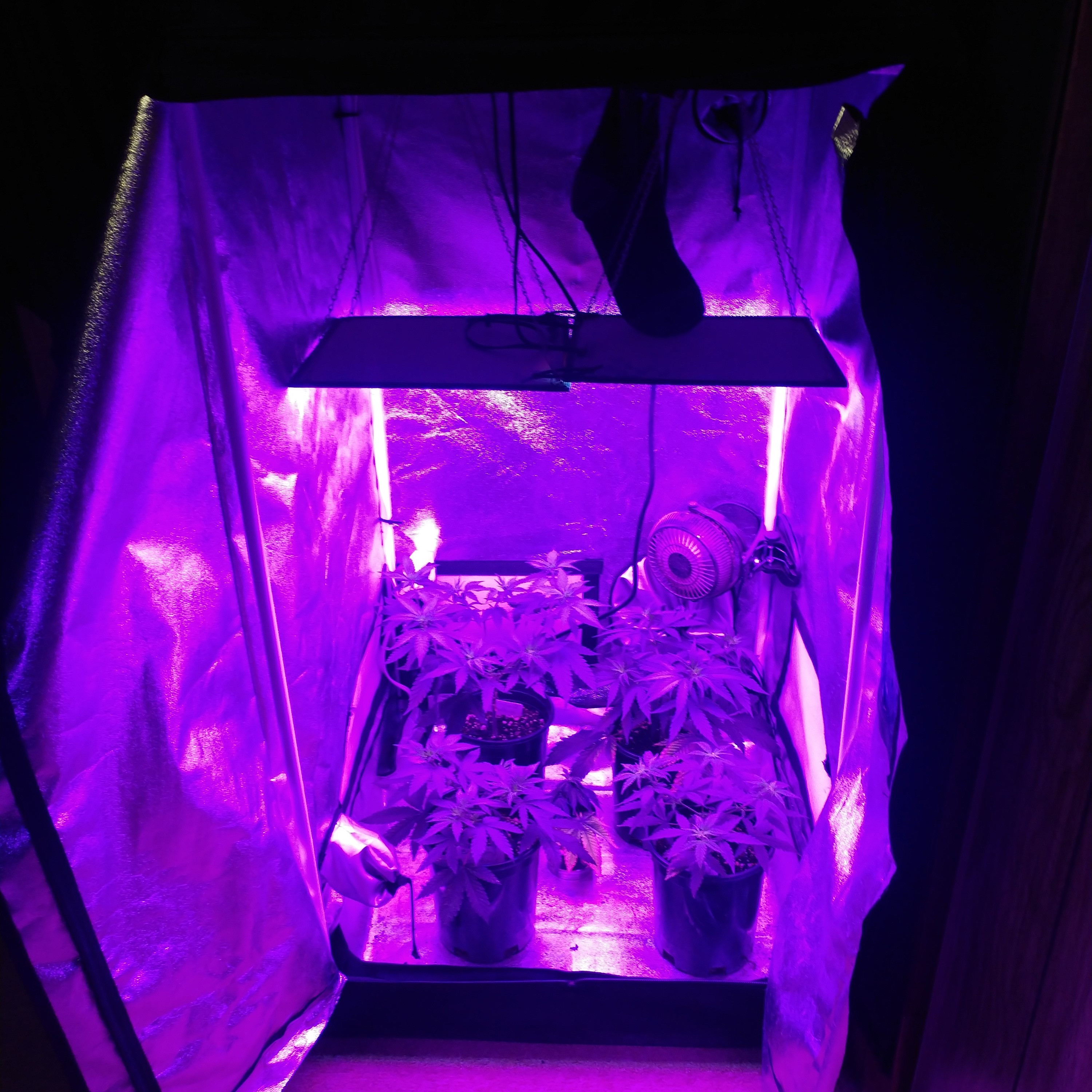 You got an exhaust system? Also with a small tent like that you might want to get a small fan for an air intake at the bottom to pull air in from the bottom. Let's say your exhaust is on the top left. You want to put the air intake on the bottom right. I have a 2x2 also(was my first tent. Had alot of hope) but temperature was always a problem when I put two 300w LEDs trying to get more yeld. So I ditched it for a 4x4 for growing and the 2x2 became a clone tent.