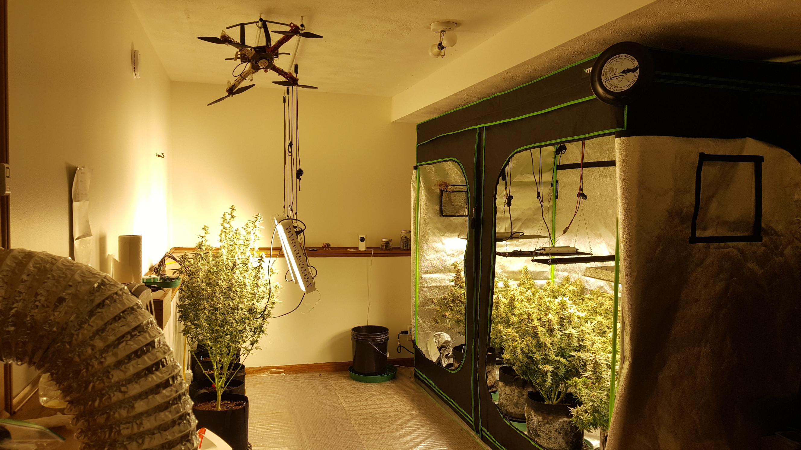 Had some Gelat-OG clones get very leggy on me so I decided to start lighting from the side until the plants in the tent are harvested. Which is 1 or 2 weeks away.The Gelat's are about a month or so behind. I'll rotate them once a day or so until they go in the tent. As you can see the air force is on standby and if you zoom in on the upper right and read the frisbee it is from a 50 year old headshop in Mpls.. I used to go there in late 60's.The Tern is a common Minnesota bird. The center of the shot is the Wyze cam. Great deal for about $35 @Lowes. You can check on your plants from anywhere and there is 2 way audio. I've seen them mentioned here before.