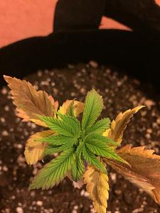 Hello all. So I have a month old mango haze that has taken a bit of a beating. It was started in potting soil then transplanted into a 3gallon fabric pot with a super soil potting soil mix. The water it was getting was distilled while it was young then I decided to give it rain water. The ph wasn’t bad but still beat this plant up the temp usually holds at 25 and a RH of 45-55. I say usually because the temp jumped up last night to 27 with a Rh of 44 but that’s never happened before. I’ve been making changes anyways there’s a bit of background on this poor little soul lol. My question is wtf causes the edges of the leaves to turn purple like that. Oh and this plant has been fed a small amount of kelp seaweed extract but the puple started before that.