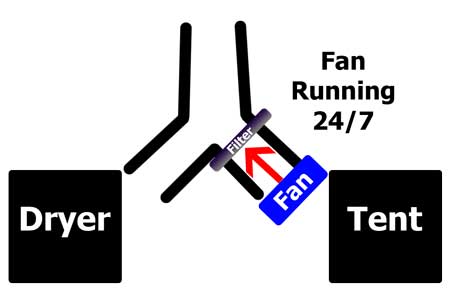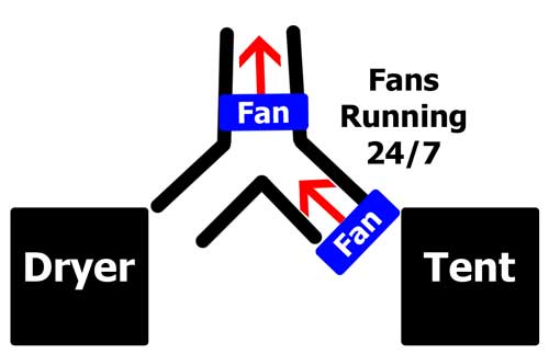 What if I had two fans? One pointing out of the tent as normal, and one above the split pointing up? Would that extra push from both fans help make sure any air from the dryer goes up instead of into the tent?