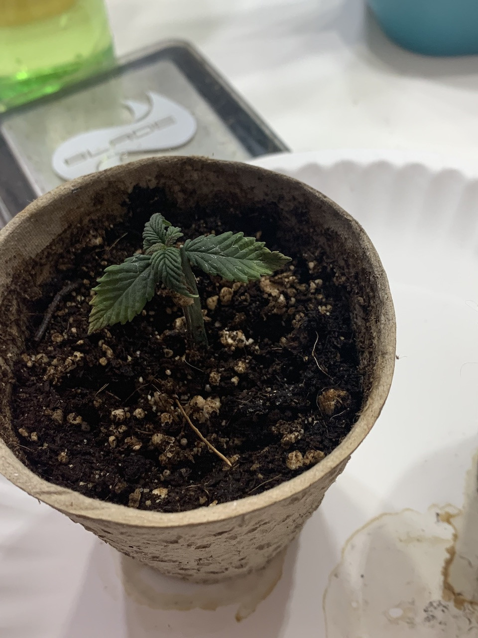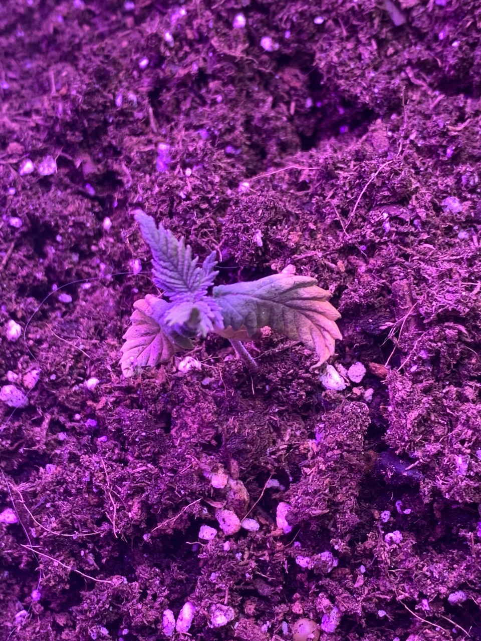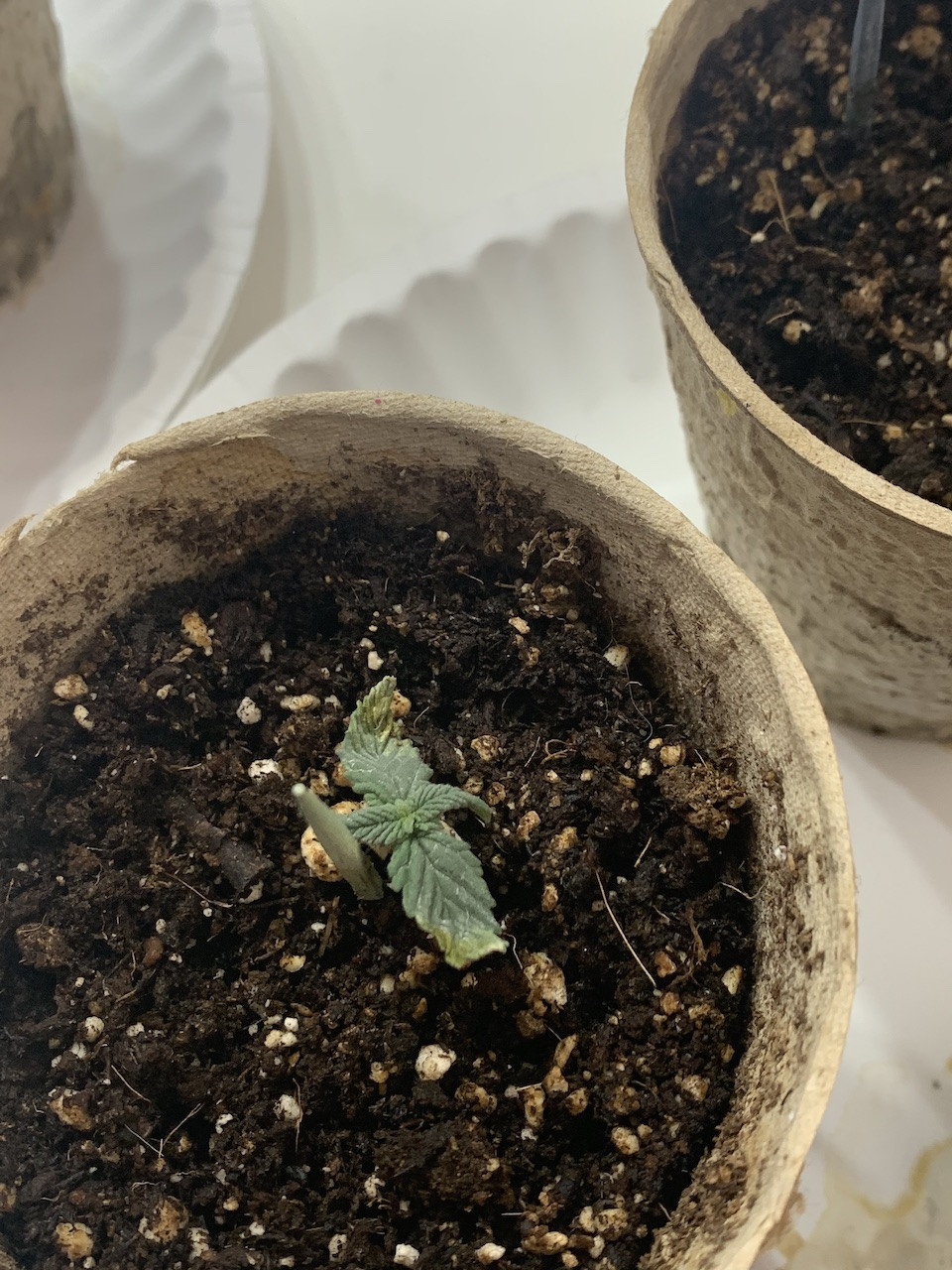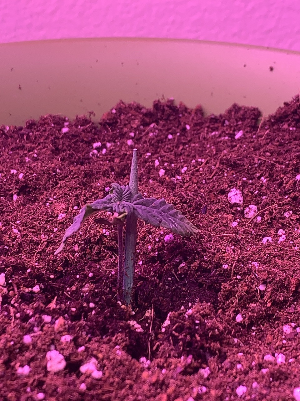 So lil bit of a back story, I planted my seeds right in miracle grow soil 1 month ago (March 19th). I started off misting them and within a couple of days, 5/7 had sprouted. Things were fine for the first week until I noticed my seedlings started to get droopy and stop growing. The next week I noticed mildew growing at the bottom of my pot container, I also noticed my leaves were starting to get burnt tips and yellow starting to travel up the leaves. I sprayed a mix of milk/water on the leaves to fight the mildew. I let the pot and soil dry out for a couple of days while no new growth was achieved. When the 3rd week came around and I still hadn't seen much growth I had determined that I had been underwatering them, or at least not enough water since for the "hot-soil". I gave one seedling a hefty dose of water and noticed it had perked up within the hour, so I watered all the rest. I kept the soil pretty moist for a couple of days and then transplanted them to 1/2 gallon pot. The yellowing didn't stop, but at this point the first set of leaves we pretty dry and crispy and curled up. But it was only happening on the first set of leaves and not the others. I went back and forth between thinking it was nutrient burn or a nitrogen deficiency. That's when I added the Fish Fertilizer because it has a lot of nitrogen. I noticed my seedling really picking up in growth, and they're showing their sex! But even with all the improvements, I now notice that the newest leaves have yellow on them.