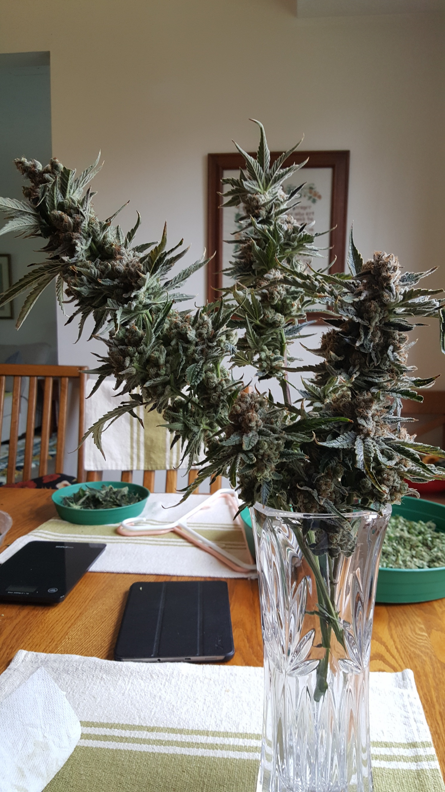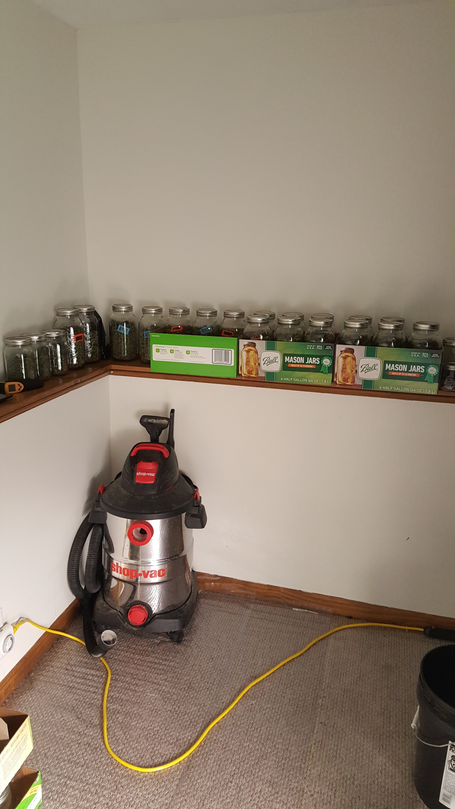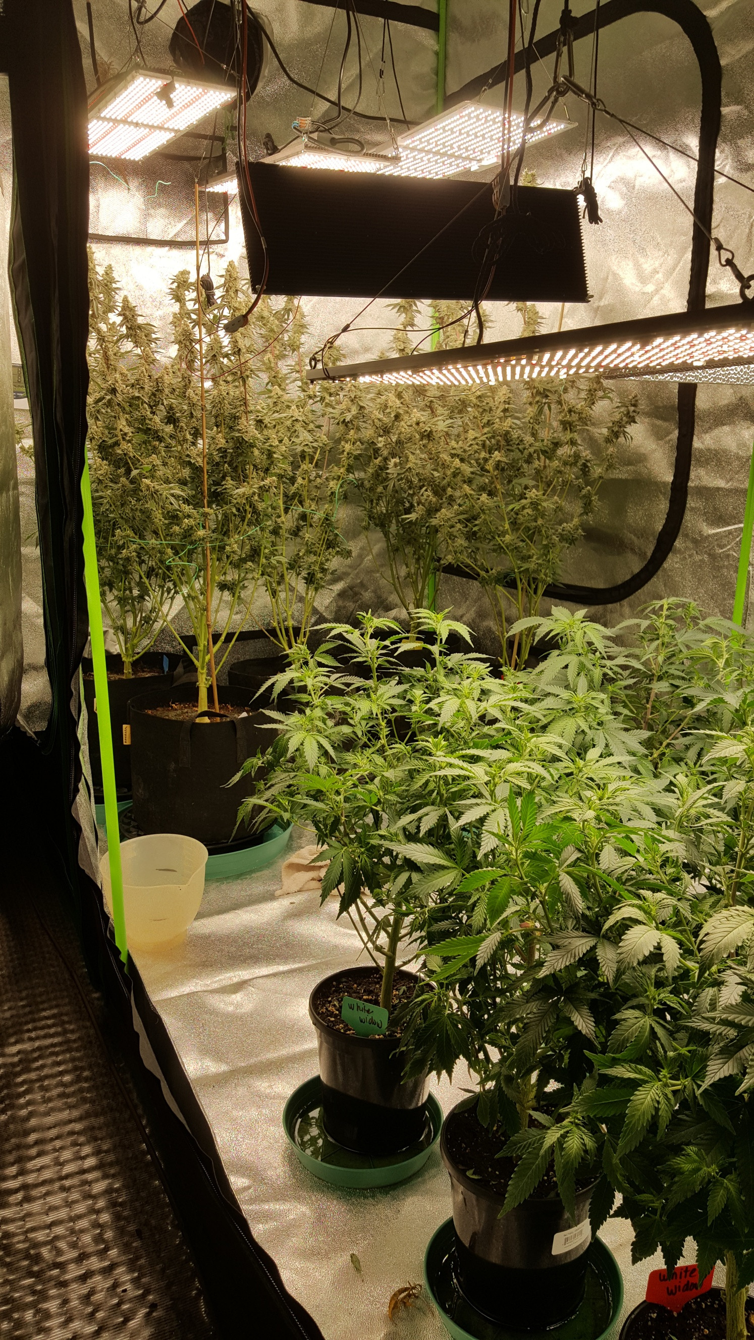 In a green dress. These are some Gelato clones that are almost a month out. 3 feet high in 5G coco buckets.Buds are finally starting to bulk up. The buds are growing in a spiral on the long branches. Very sticky and I will need to put stakes in to stabilize the spindly branches which are starting to bend from the weight. The mother plant produced some very potent buds. I'm throwing everything into flower so I can get on with a bunch of different autos. It's tough only being able to grow 12 at a time in MI but I'll get by. That's like a plant every week and a half. I take at most 3 puffs per night. The half gallon jars in the background are my backlog. We may have a problem Houston.