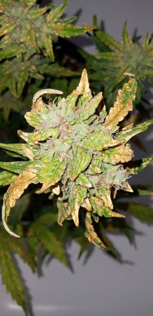 Here's what's going on: The top buds on the main cola appear to be ripe, with cloudy trichomes (as far as I can tell). There are numerous buds below that AREN'T ready and will likely mature with my other three plants.