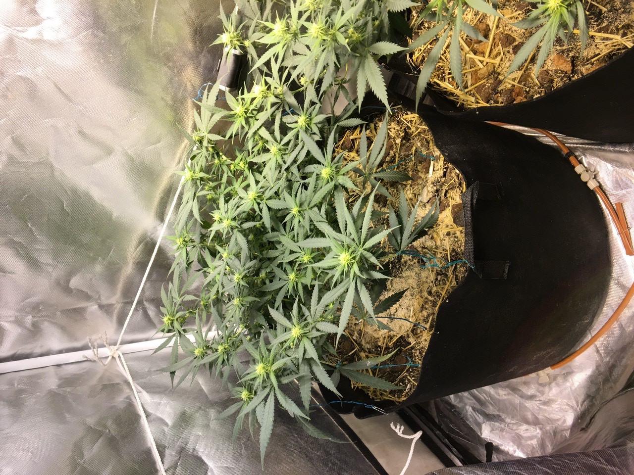 4x4 tent, Platinum LED P4-XML2, four Patio Pickers. Vegging Super Lemon Haze, Durban Poison and two Tangie x Blueberry crosses.