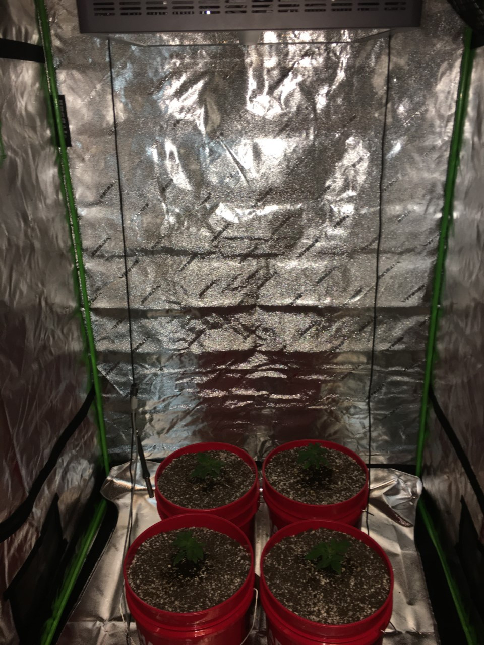 New plants (~18 days out of the ground) and just put in grow tent with viparspectra V1200 light yesterday. Previously they had been under four, 23w daylight CFLs at ~4". Instructions from viparspectra (attached photo) say for 3-5 days (acclimation period) to put light 44" to 48" away from plants with 10 on 14 off with just the vegetative lighting on. Sounds very conservative to me but I have no experience at all with this. I went with the ~44" and just the vegetative lighting on but I kept the lighting schedule at 18 on 6 off. Attached are photos of the setup, the instructions from viparspectra and a close up of a plant. I am tempted to straight to the 32" to 40" with vegetative and bloom lights both on.