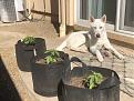 Good morning! My guard dog Renegade protecting my plants. Lol