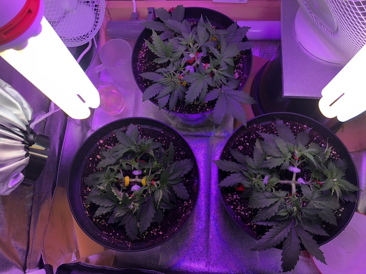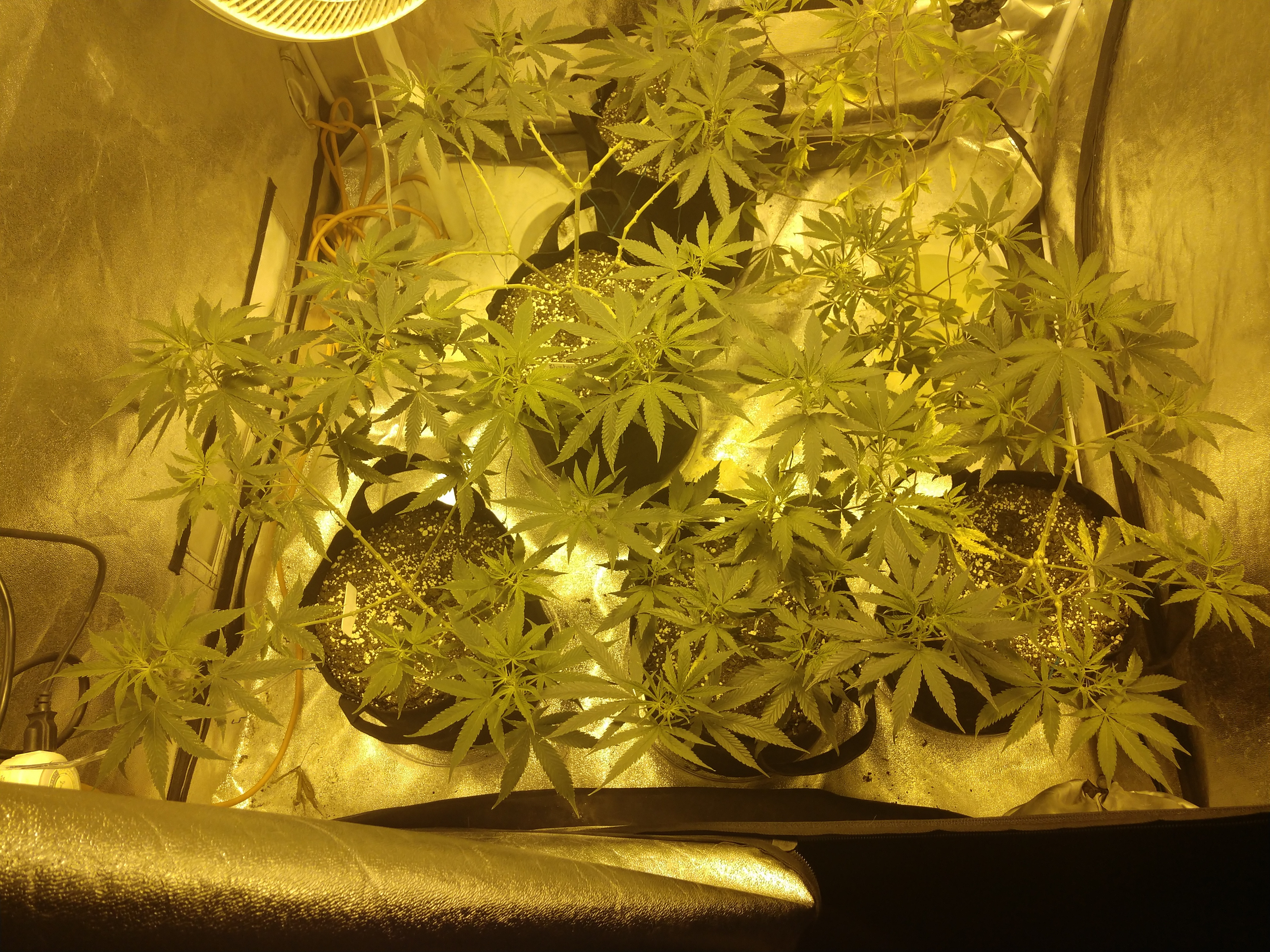 Yep, they’ve all been quadlined. Nodes 1 and 2 removed from all 3 plants. This one must be leaning more towards the Indica side where as the other 2 are screaming Sativa at me. So mush more squashed and compact compared to the other 2. Fills back in by the next day after training. Doesn’t drink as much as the other 2 either..they seem extra thirsty to me? Drinking 1.7L every 48hrs. The little bushy one drinks about 1.4L every 48hrs.