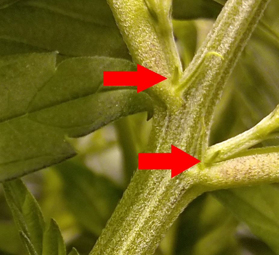 Also, you want to look at the space between the main stalk and the branches. In your pictures, you feature new growth which is often confused with the actual male and female parts. Here's a picture from my last grow of what you're looking for: