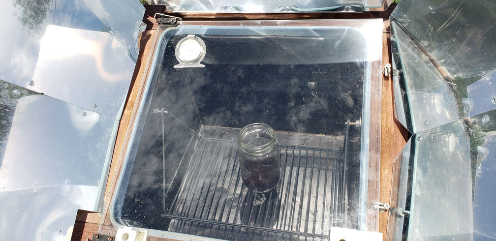 In the tutorial, they illustrate using the "double boiler method". Using a solar oven will be MUCH safer, as there is NO ignition source...but solar cooking presents its own challenges too. 1. Gotta have sun, preferably full sun! While you can cook, as long as there's a shadow, it may take a long while. Having full sun will allow you the flexibility to adjust the temperature (by moving the oven/reflectors or cracking the lid open). 2. Condensation may get in the way. I've been solar cooking for well over a decade. One truism I've learned is that if you keep the lid tightly closed, your top glass will become fogged up. This will cap out your temperature, probably staying at around 300 degrees F. For this event, I'll be cracking the lid open. This will not only prevent condensation but any wind will aid in evaporation. 3. Wind may RUIN your day!!! I've lost count of the meals ruined or partially ruined, when the wind tipped my solar oven