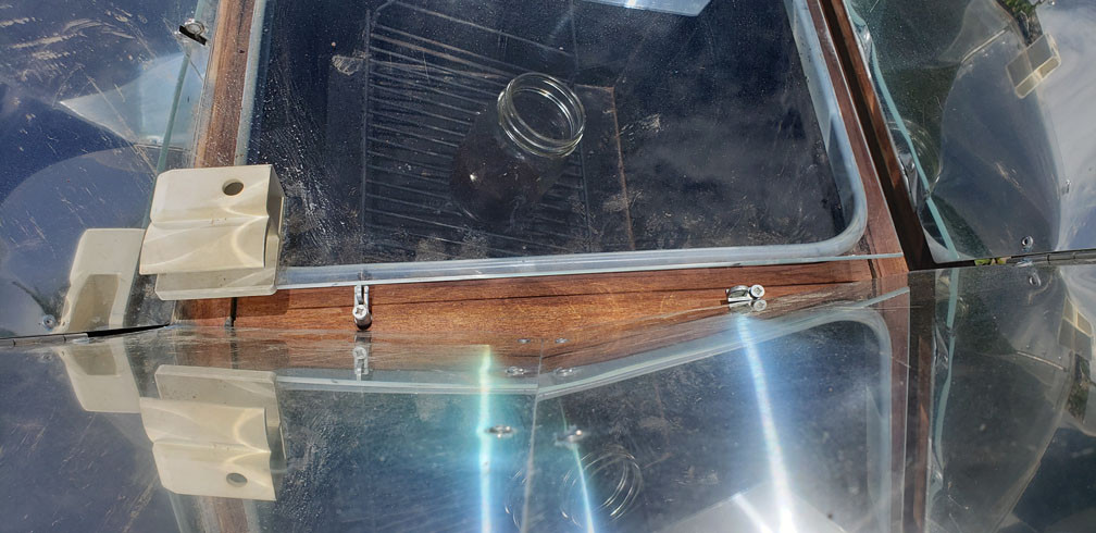 These days, I weigh down the leg with weight. Even so, I'm keeping a close eye out.I expect my temperature to max out at 250 degrees F. It's 2:30 p.m. here and I just set my solar oven up and put in a pint jar with a bit of tincture in it...