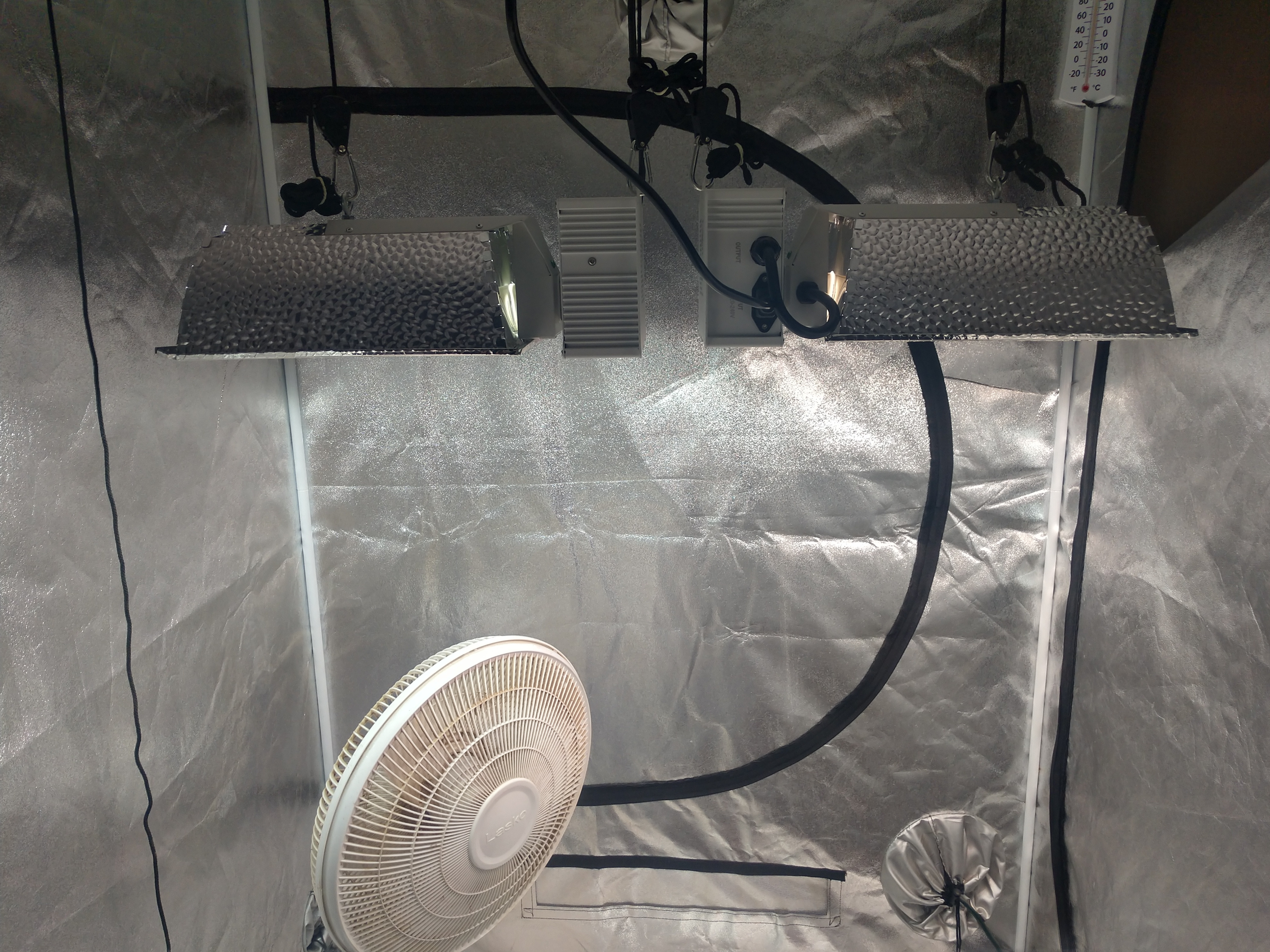 2 old 400w iPower lights with the ballasts outside the tent with good ventilation (one segment of the AC is blowing at them) so they arent adding heat to the inside. Both lights have brand new vivosun 400w MH bulbs for now, and I've got fresh HPS bulbs for when it gets to that point. Running 24/7 for now.