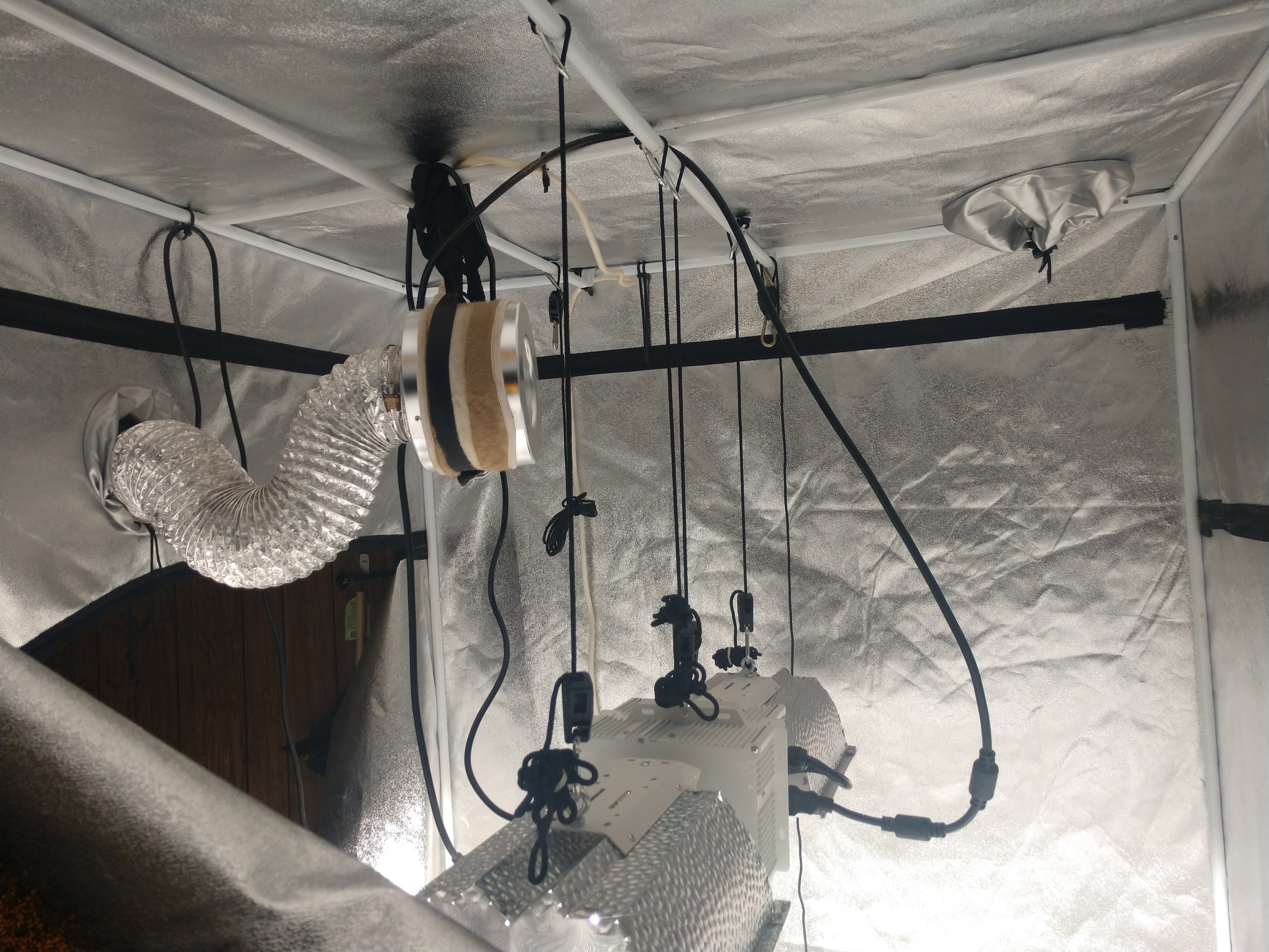 I've included some photos of the inside of my tent. The 4 inch fan/filter on the bottom is an intake since there are some litter boxes nearish the tent, and I didn't want any of that nastiness getting in. The other end of the intake hose is ziptied up to just in front of a single-room ac blowing cold air, so that helps keep the tent nice and cool. There is a 6 inch fan/filter you can barely see at the top of the first photo, pushing air out, which currently is just going into the room but I am prepared to have that blow outside if I need. So far with that AC going though temps in that room are pretty nice, mid to high 70s, even with all the lights etc going. I have a small fan in the tent for airflow that you can see, but it's currently turned off in case I was windburning the plants, as the leaves are curling down like I said. Solidly negative pressure in the tent, too much with JUST the filter so I added the intake fan (smaller than the outbound fan/filter) to help balance it out.