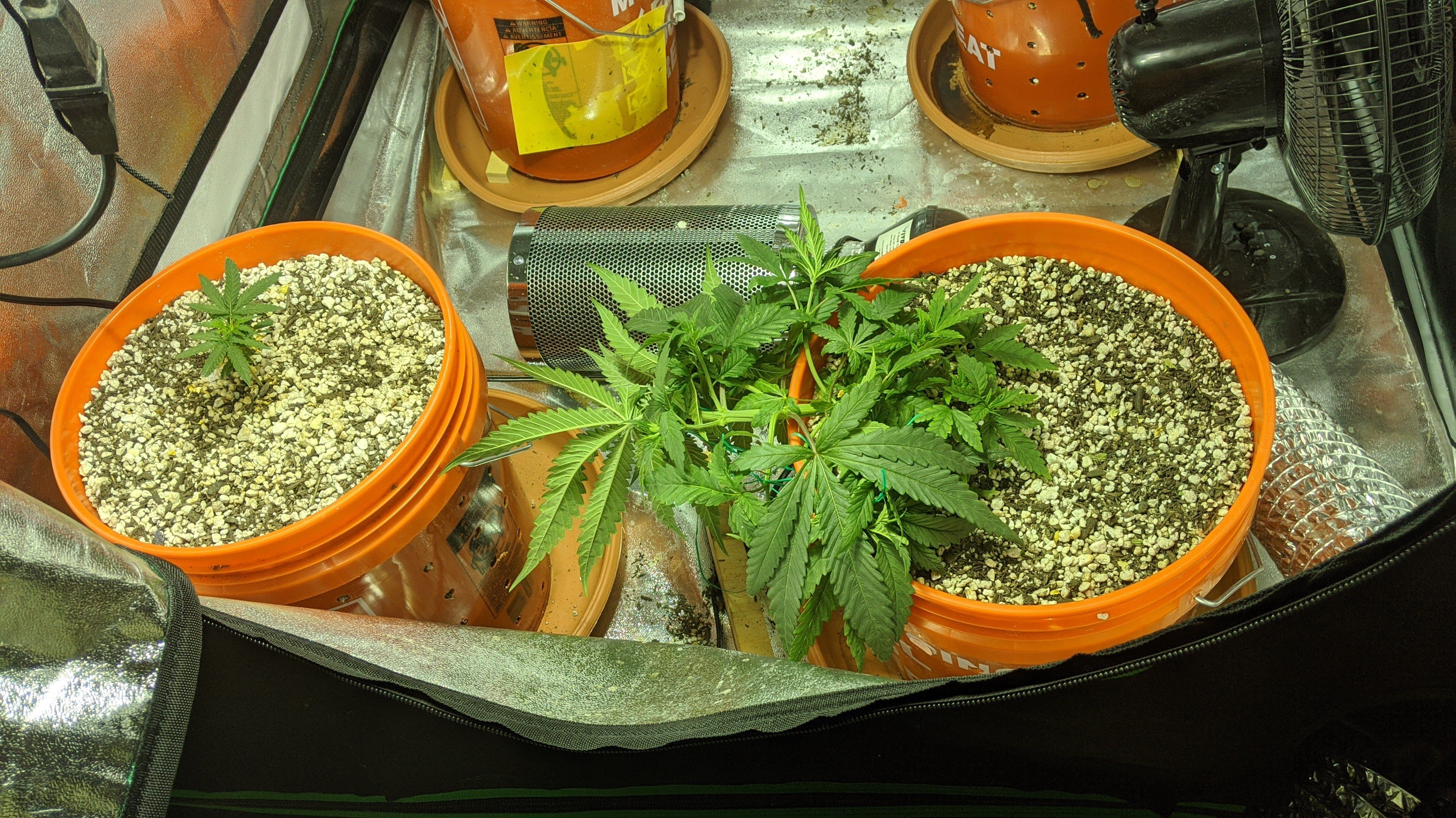 Well, we lost the sour diesel. Both the sour diesel and the strawberry lemonade took the transplant poorly (I probably fucked up the roots somehow if I had to guess), but the SD called it quits 3 weeks ago, then 2 days later the SL FINALLY started to recover! It spent 3 weeks basically at deaths door then all of a sudden a whole new set of nice green leaves. Bummed about the SD but I have more seeds so not too worried.