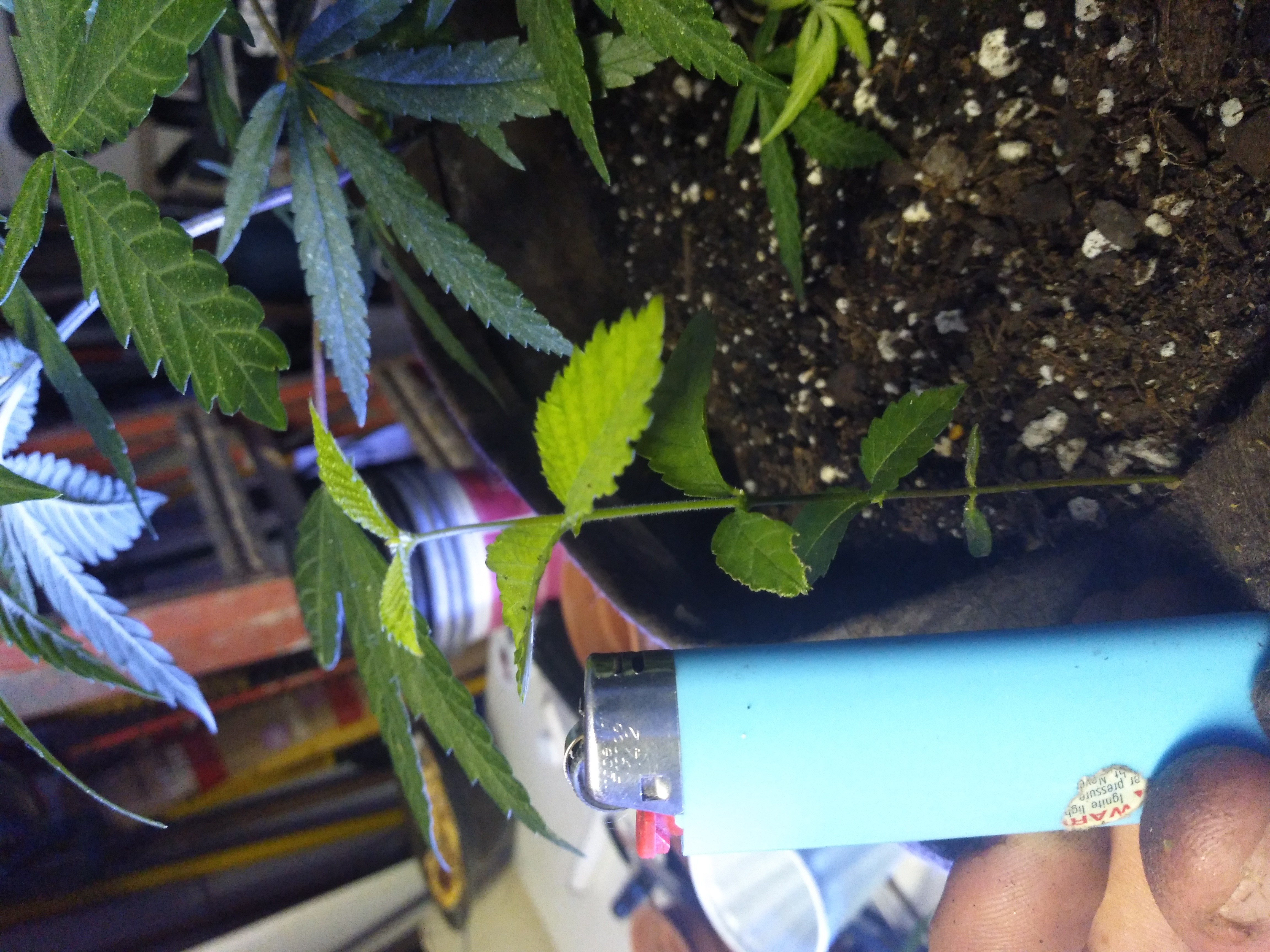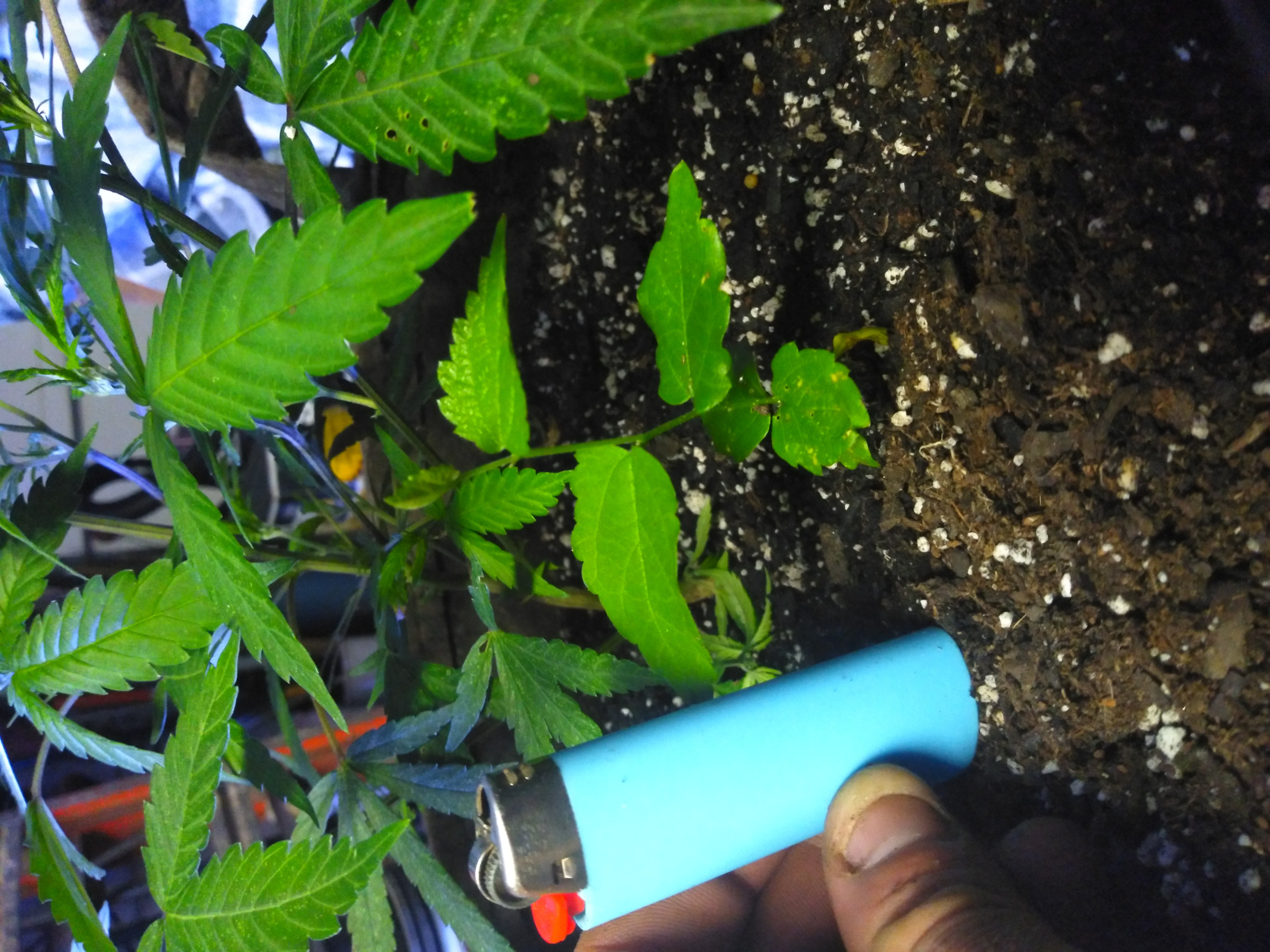 I plucked the.fat one cause I'm 98% sure that was a type of vine but the weird one that looks like cannabis but just with only finger leafs and yeah you thought it wasn't getting light but when I got it from him he has a nicer like 600w or something that's what was vegging the plant with the little twig in it's pot and the twig is like 8 inches away from the whole plant so he isn't even being shaded if it is cannabis something is seriously wrong weather it's a male or mutant I don't really want it I might leave it for a week just to see how slow it grows but yeah he said he got the plant as a clone got it home transplanted her the same day and he said it was like 3 days later when that thing popped up and that's almost a month ago..... So it's the size of a light but stem is super tiny but it's like hardwood feeling doesn't feel bendy at all so weird for a seedling....