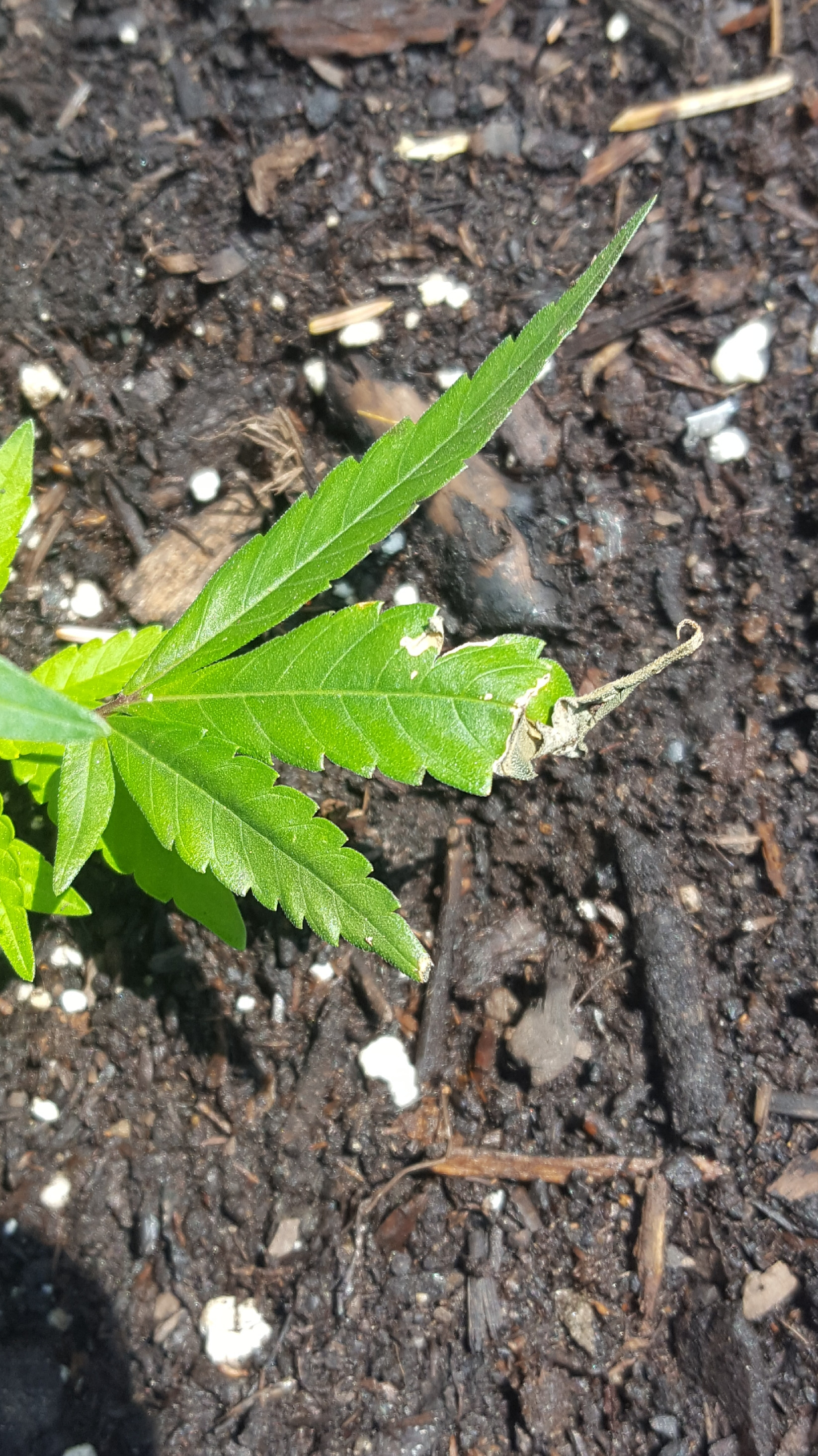 Hey, I'm a relatively inexperienced grower looking for help identifying what is going on with my plant. I got a Bubble Gum Kush clone off of a buddy a few days ago. It was well rooted in a solo cup and looked to be in fairly good condition except for a couple small holes in one of the leaves. I transplanted it into a temporary pot filled with Miracle Grow Pro Mix Organic Vegetable and Herb Soil. It is being grown outside in direct sunlight for 10 hours starting at around 7am. I live in the great lakes region and it has been fairly hot and humid recently with a high of 32°C or 90°F yesterday. I water a decent amount every morning except if it rains the night before. Any help identifying what is wrong with my plant would be greatly appreciated. It looks like the end of the one leaf is curling and dying. There is also some small holes in a couple of the leaves with a brownish tinge around the edge of the holes.
