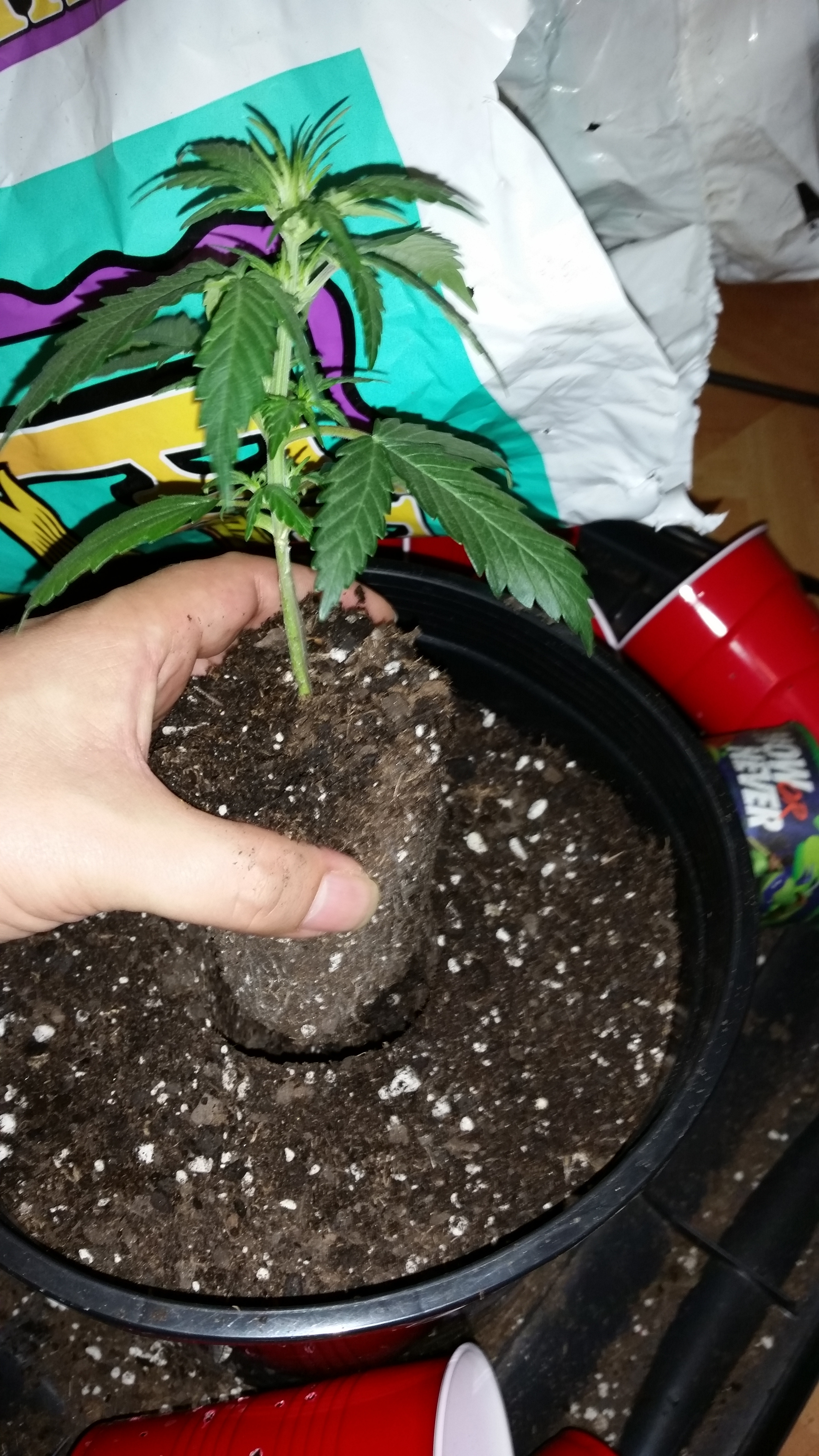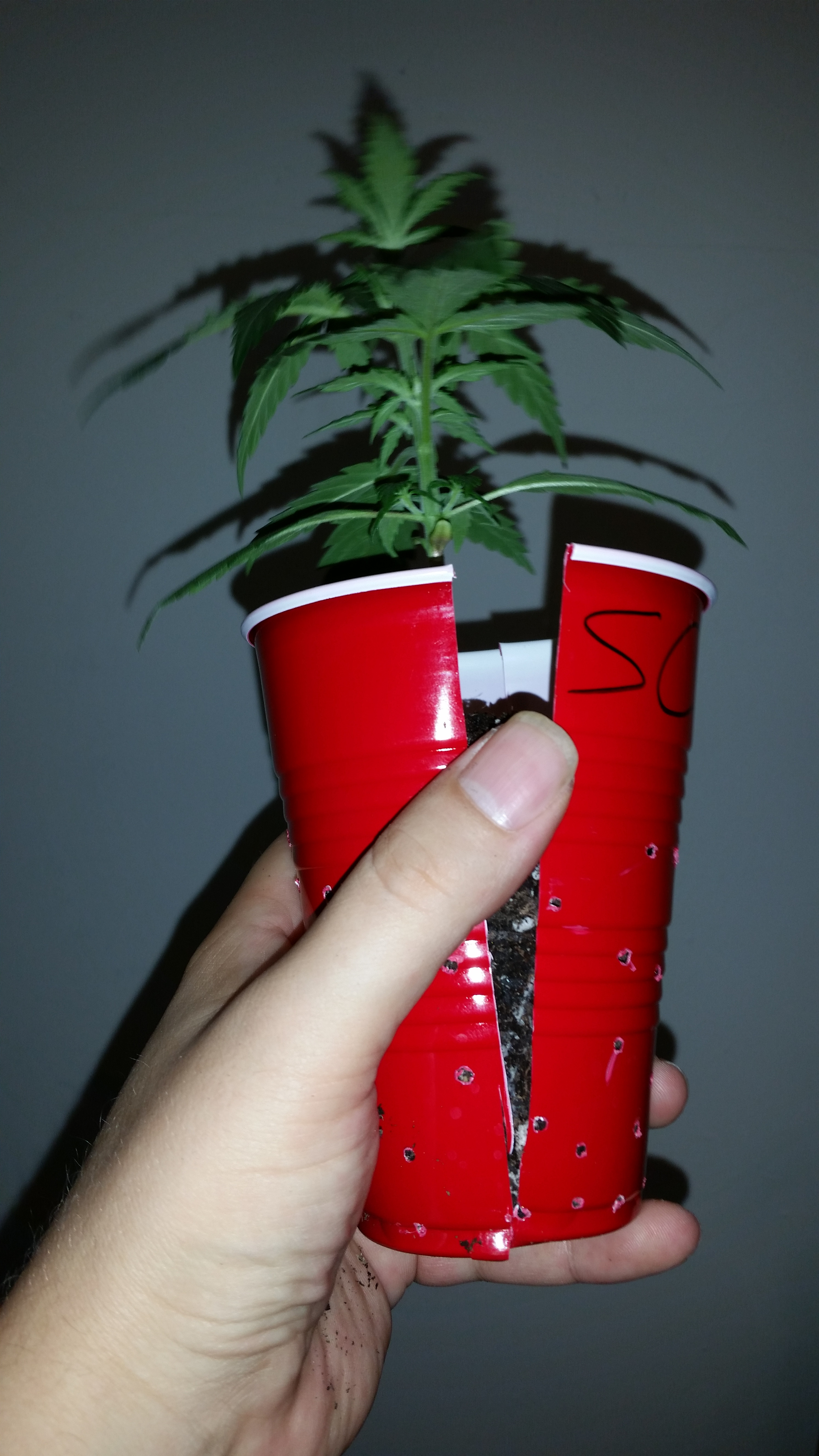 I start by cutting along the edge of the bottom. Maybe 3 or 4 around the bottom, then a triangle pointing up from the center of that slit with the top point pointing to the rim. Just big enough that your soil doesn't come out(too much anyway but small cost to pay) when I'm ready to transplant I can just tip the cup on its side, not any further for any soil to drop on the leaves and shit. With the cuts in the bottom I just push the bottom, I can push about an inch into the cup and it nicely pushes the root ball right out of the cup. I figured this out like 5 years ago by accident after over watering some under drained cups and never looked back it's like night and day. I used to cut from the top of the cup to the bottom on both sides and try to remove the cup from the root ball or squish the cup and try and work it out upside down. My way I haven't damaged a root ball in a long time and they're is almost no recovery time after transplant. The pictures don't do it justice but you get the idea I'm sure. Let's use our imagination π