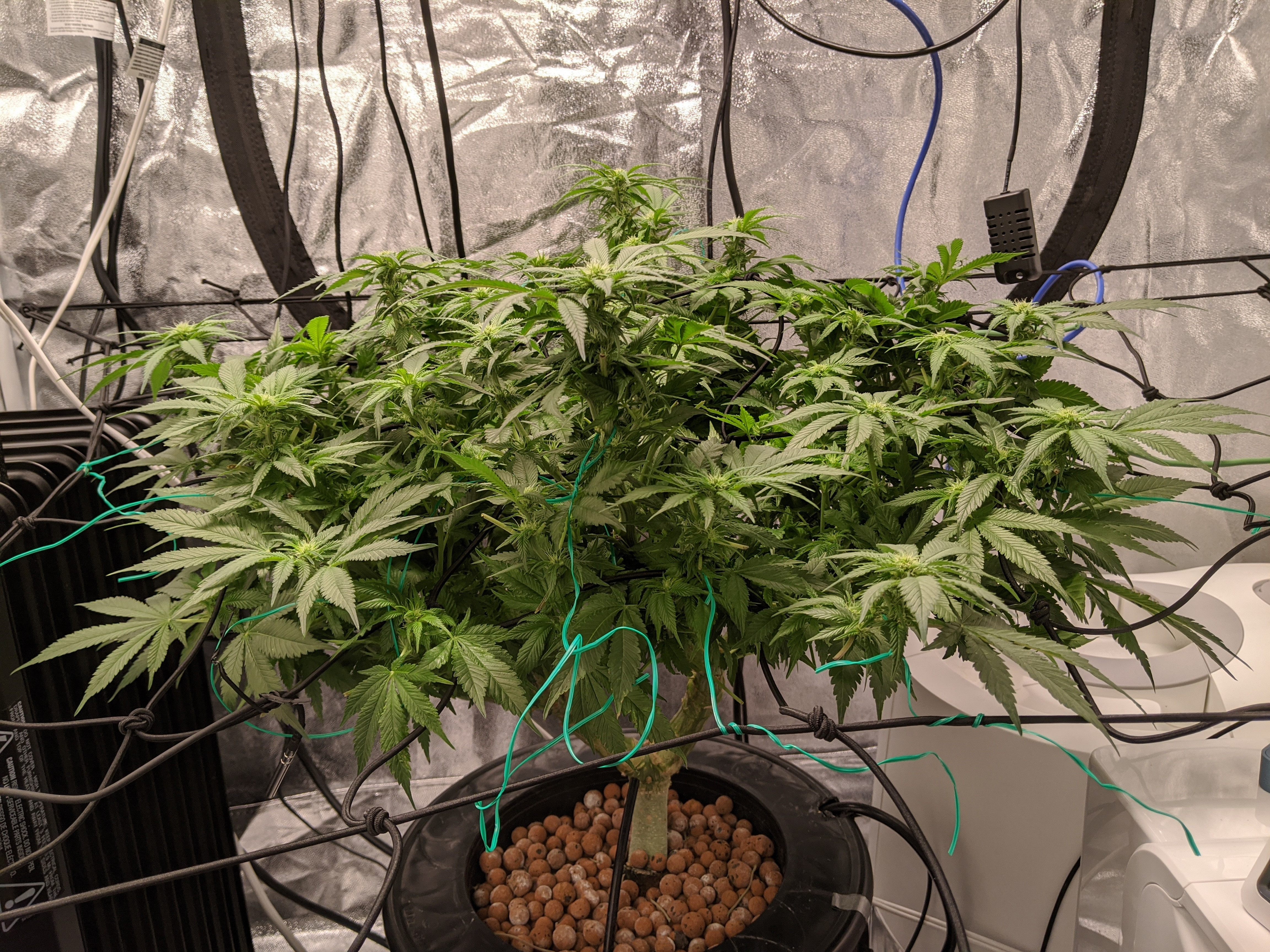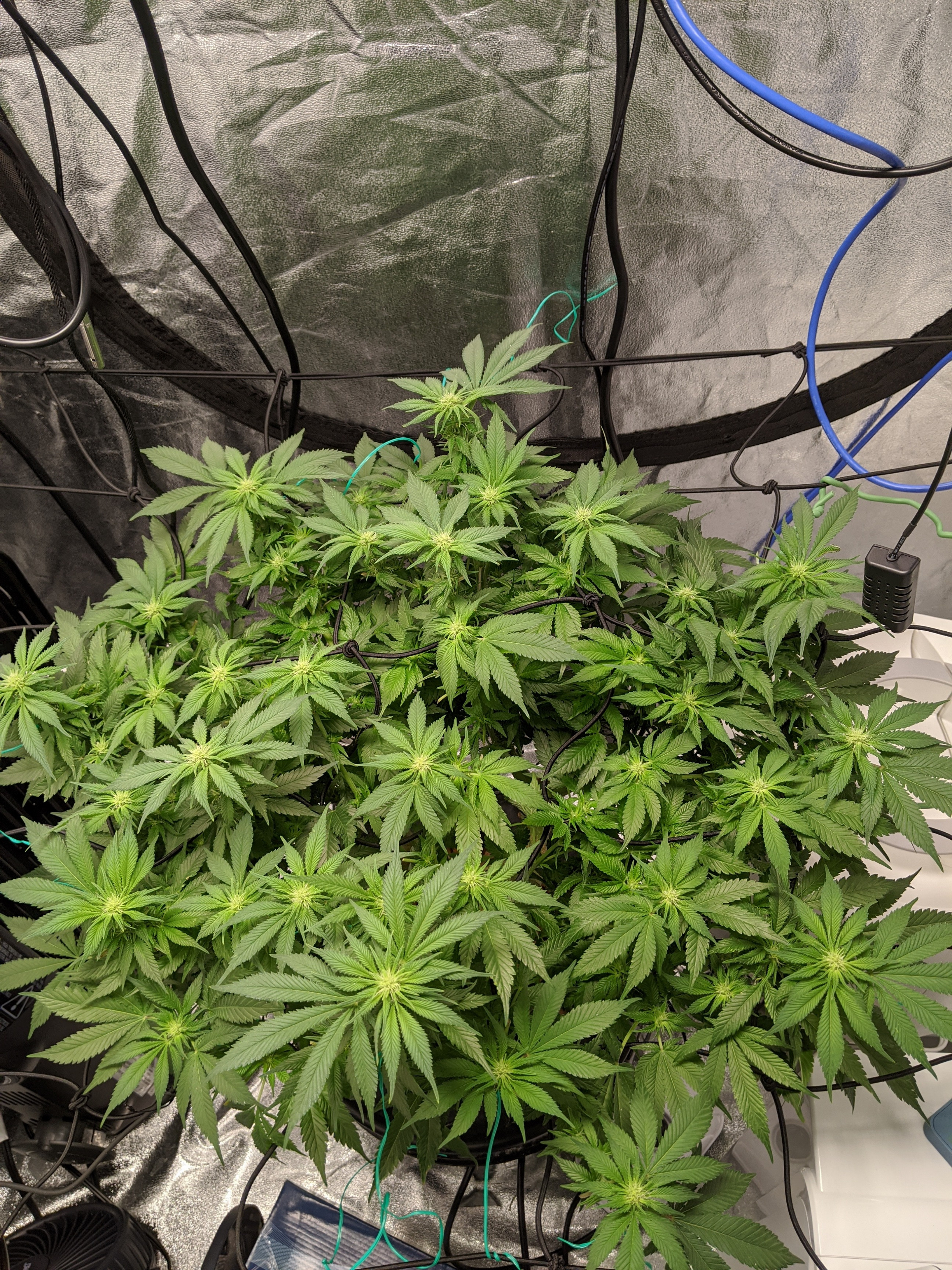 Wow! she's a monster...second pic is a good one. You want to expose all those snowballs. Try and tuck those big leaves down under your bud sites..if the dont want to co-operate..cut them off. She could use a good defoliate real soon..nice canopy, looks healthyShappel S3000 3.5x6x6' ice hut