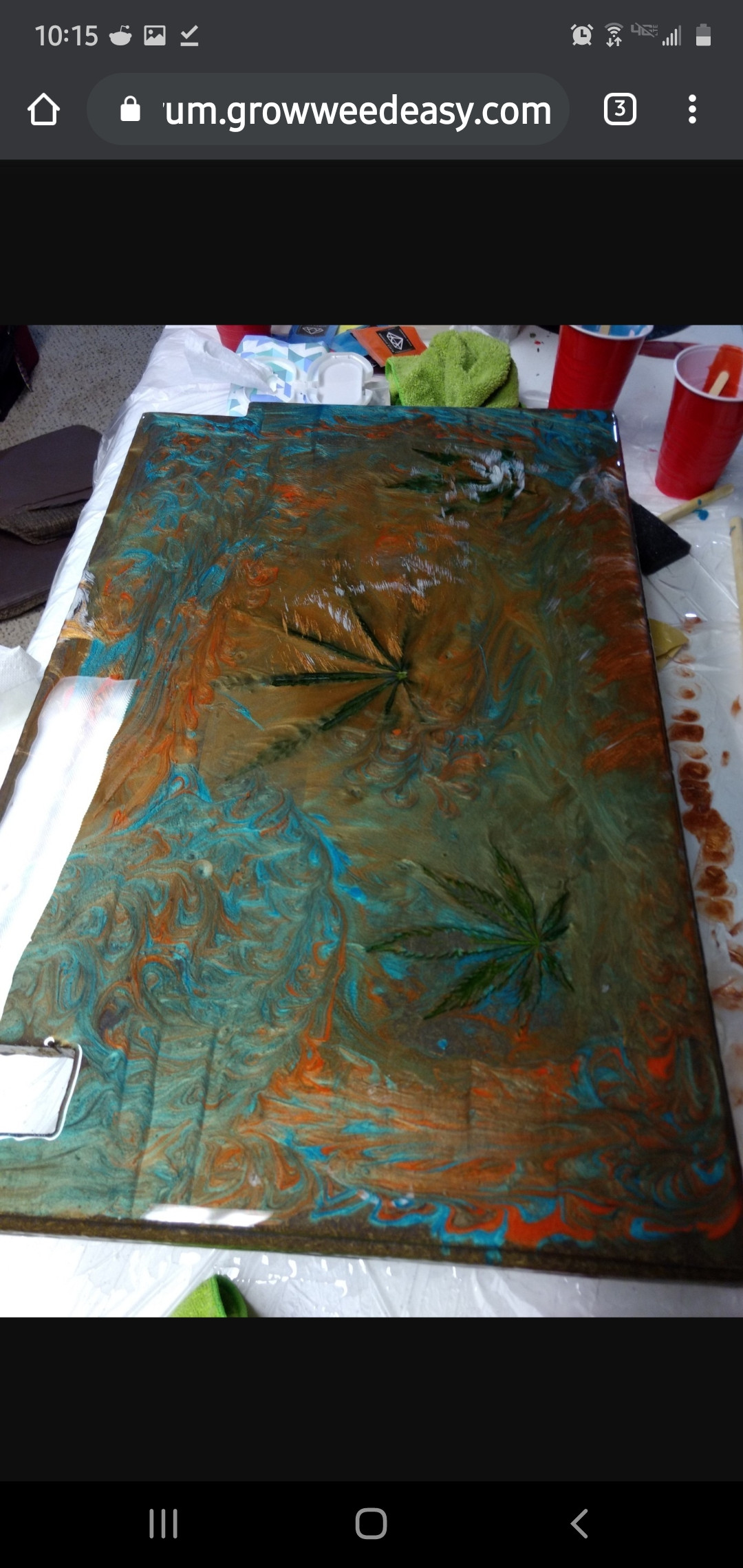 I have a little weed shelf where I smoke. I epoxied it with 3 weed leaves and some pretty cool colors. Sadly, I did the colors over the weed leaves so they are harder to see, but they are there lol