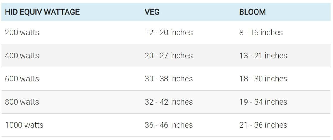 as for my light problem, i actually managed to figure out the perfect solution! i found this handy guide on LED wattage (labeled as HID equivalent wattage) to optimal distance from the plants: