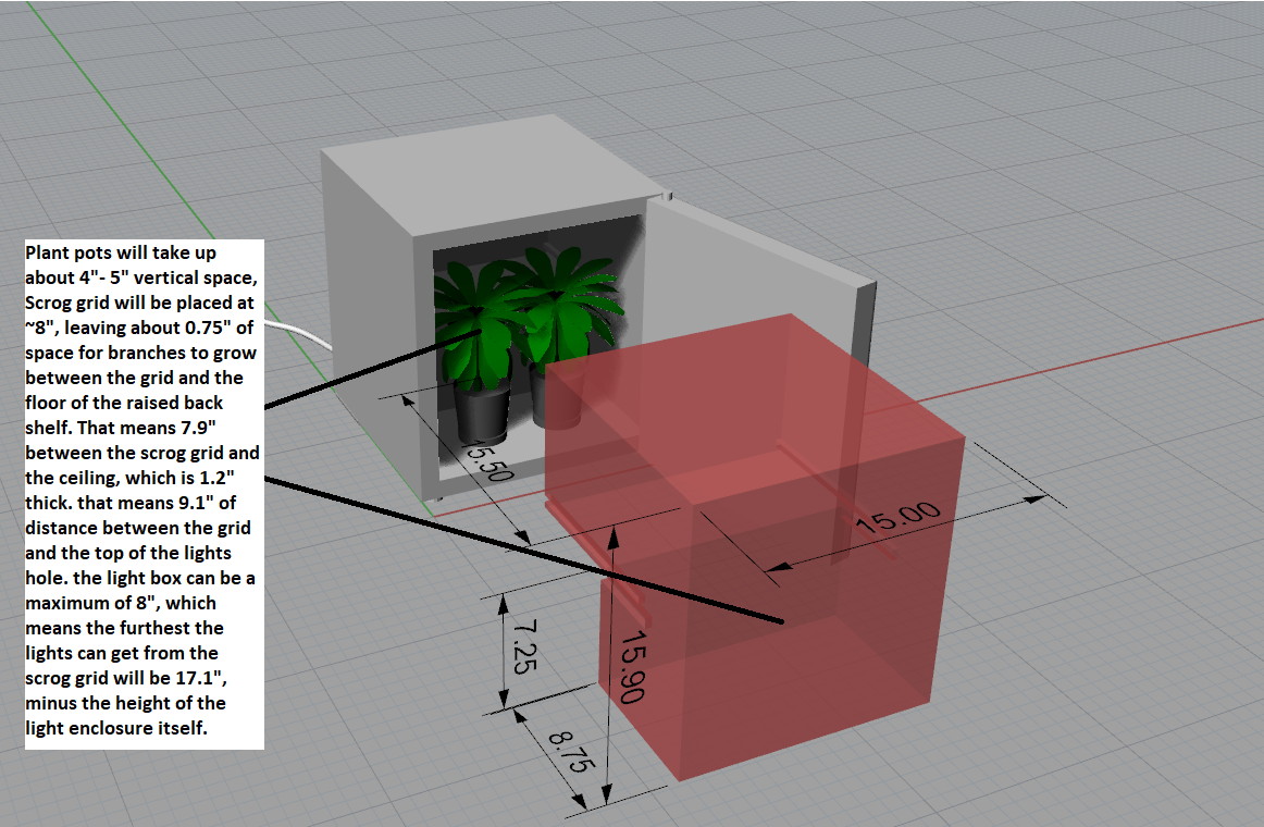 Like that little note says, the plan is to have the lower front area be taken up by the plant pots (still deciding between hydroponic or just normal soil), then a few inches of growing room before we hit the ScroG grid, which will take up the entire footprint of the fridge interior, and be about an inch above that back shelf area so i can train/top the branches back there to get the highest possible yield. However, this leaves VERY little space between the buds and the light (minimum of 7.9 inches, maximum of 17.1 inches, and that's without factoring in the thickness of the light box itself), which if i'm using the LEDs that i want to use, is a recipe for some nasty light burn. I'm brand new to the growing scene, but based on my experience with electronics, would i just be able to install the LEDs really close, then turn the power down until the plants are getting the same amount of light that they'd be getting if the LEDs were 4 feet away at full power? I feel like that would work, but at the same time that solution seems too good to be true. Feel free to let me know if i'm right or wrong with this assumption.
