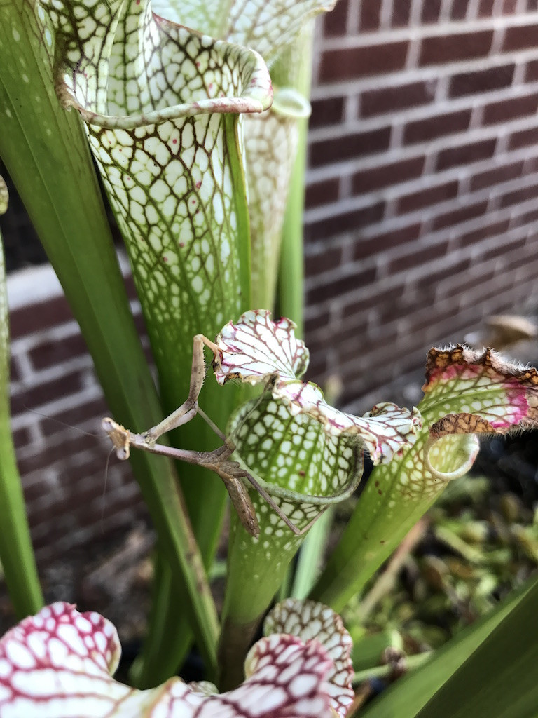 ! While i thought the mantis's were being decimated(finding all kinds of skeletons around the garden)..come to find out that they shed their exoskeleton six times before they reach adulthood. Their masters at being undetected...i have a plant on my deck. There has been a mantis in it since they hatched(2 weeks or so)....cant find the faker if you stare at it for 20 minutes..then all of a sudden..it pops up for a pic. They can change colors to mimic there surroundings too. i really like these bugs. they seem to prefer winged insects..sand flies,aphids,fruit flies,leaf hoppers. Ant's and earwigs..not so much. maybe when they get a bit bigger.