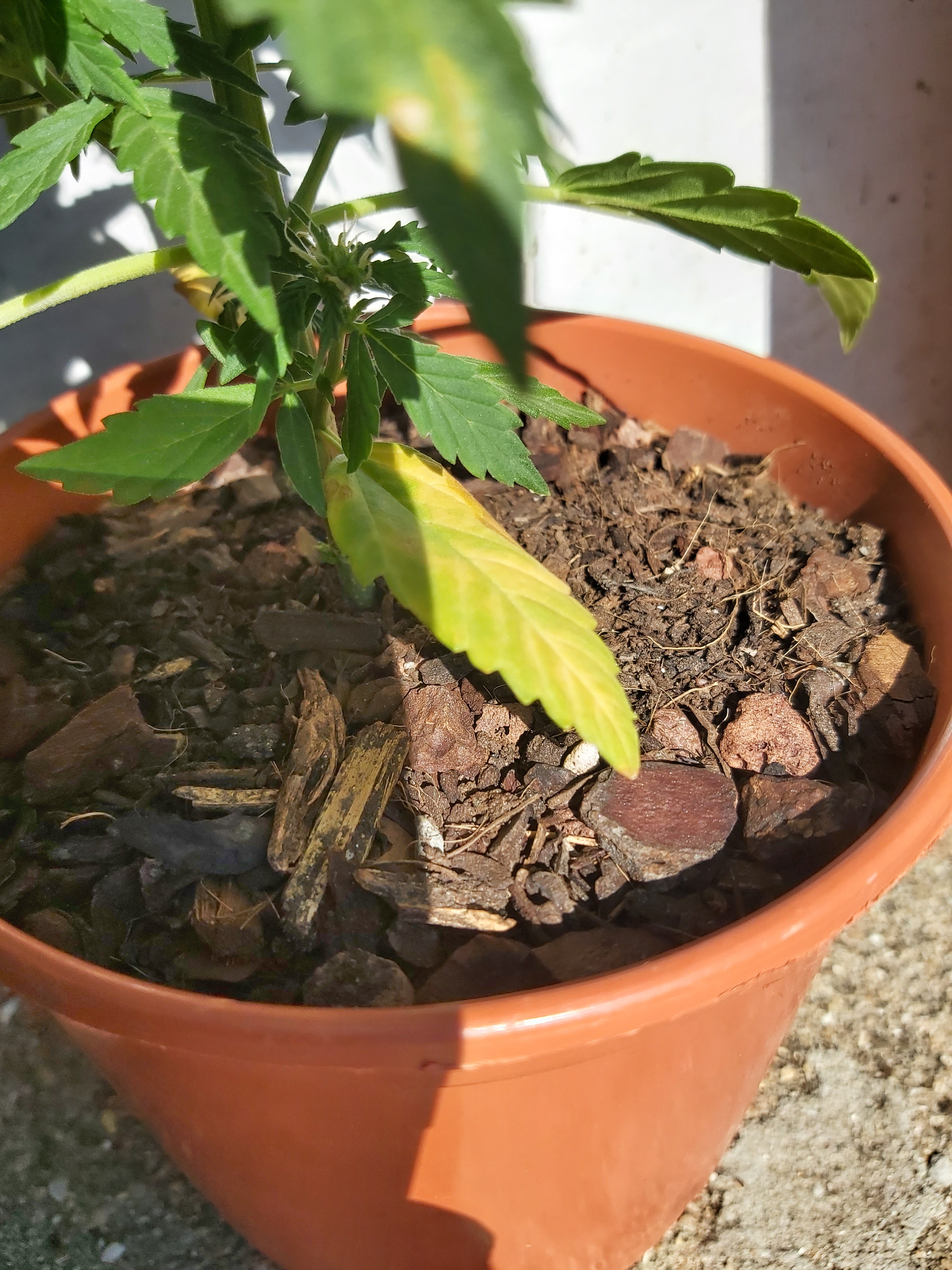I'm growing in soil, feeding organic nutes and she's been thriving. She's a small, autoflowering,outdoor grow, in a 1.5-2L pot I'm about 1.5 weeks into flowering (31 days overall from sprouting) and everything else looks healthy. All leaves are nice and green from the top to the bottom, from the new growth to the old, except that first pair (Apart from a few insect bites here and there). Overall no deficiency signs everywhere else.