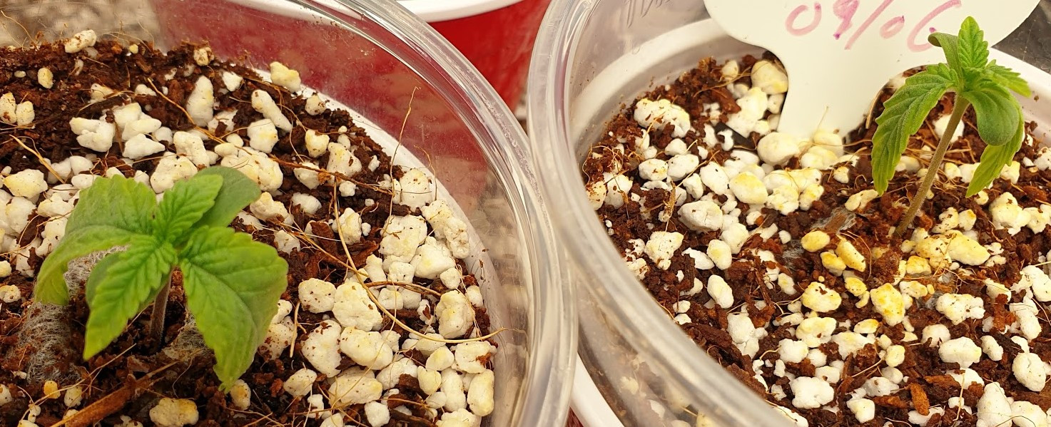 12/06 - Today I transplanted the Jiffy Plugs into clear plastic cups so I can monitor moisture, with red solo cups on the outside.