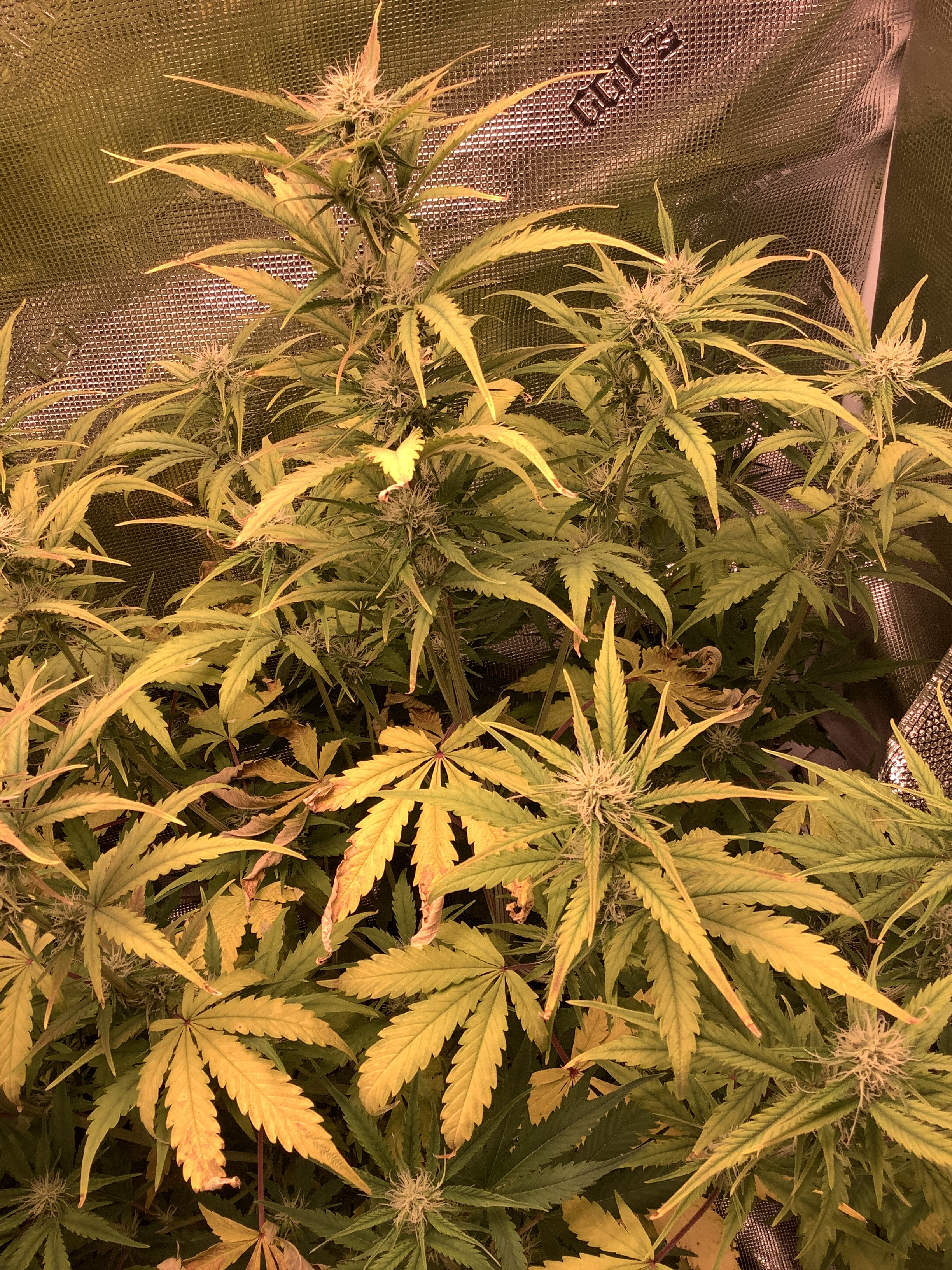 2 gorilla glue autos going in pure ffof. Electric sky V2 600w. Calmag. 10 gal fabric pots(yes I know they are way too big). Ph of water 6.5ish. Well into flower but not sure how old exactly. Everything was goin pretty well until I added some liquid nutes last week. I hadn’t added any up until then but one plant was showing signs of what could have been deficiencies so I mixed up 2ml per gallon each of big grow and big bloom and some calmag. I watered heavily. This turned into nutrient burn and overwatering. But they were still good overall so I wasn’t worried and really one was actually completely fine for days so obviously I didn’t over feed that much, just one was more sensitive than the other. Well the 10 gal pots bite me on the ass because the water took almost a week to dry. During this time my babies were becoming less vigorous and more sickly and yellow. So I finally watered again this morning after letting the pots almost completely dry out. Here are some pics 10 hours after feeding. This time I added 2ml of big bloom and some calmag only and watered half the amount. I think I am seeing even more burned tips and yellowing. I don’t think flushing is an option because it will turn into overwatering due to the size of pots. What do I do? How bad is it? Should I stop feeding completely?