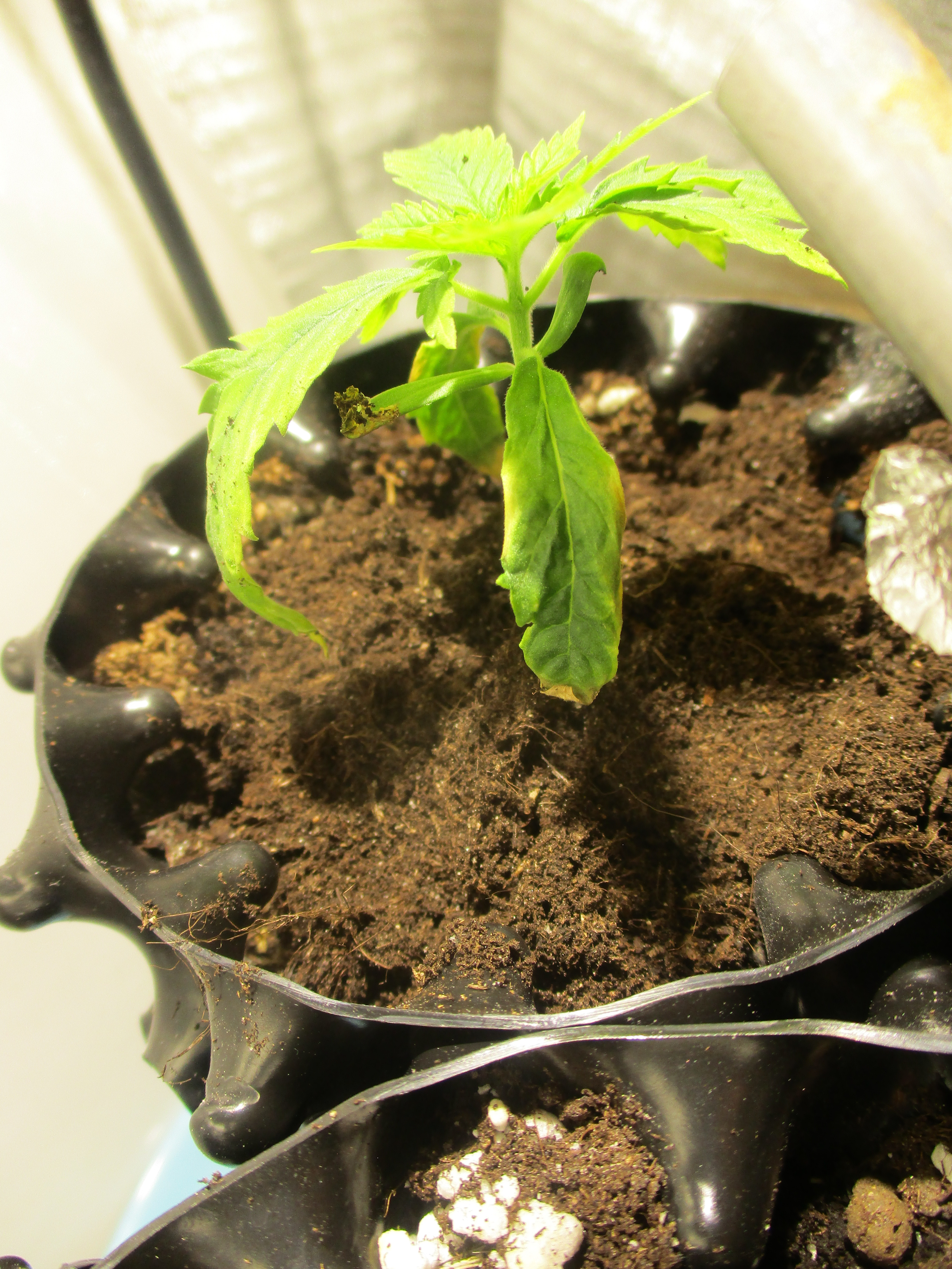 anyways...1 plant ca 2weeks old now autoflower feminized starts to look droopy and yellowish ;( see pic. this pic was before watering. i also lowered pH of water because it was ca 7,5 ...now its ca 6,5 i used tiny vinager in water hope thats ok...?