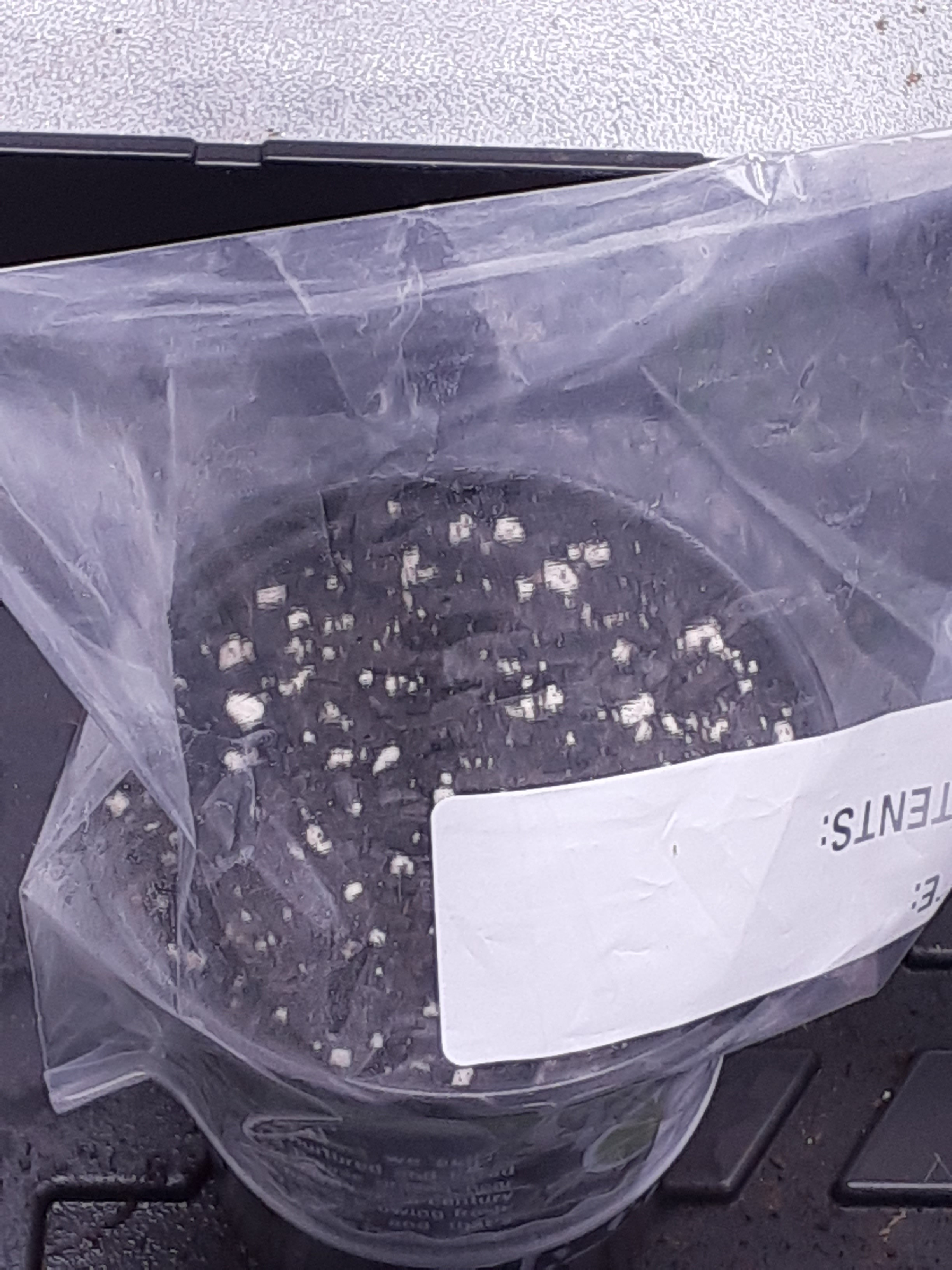 My one little bag seed 1 month old sitting in time out do to being too slow for regular photo plant. In the green house i check her every few days to see if she is growing i can't tell LOL put a stick into her soil to mark growth from it.