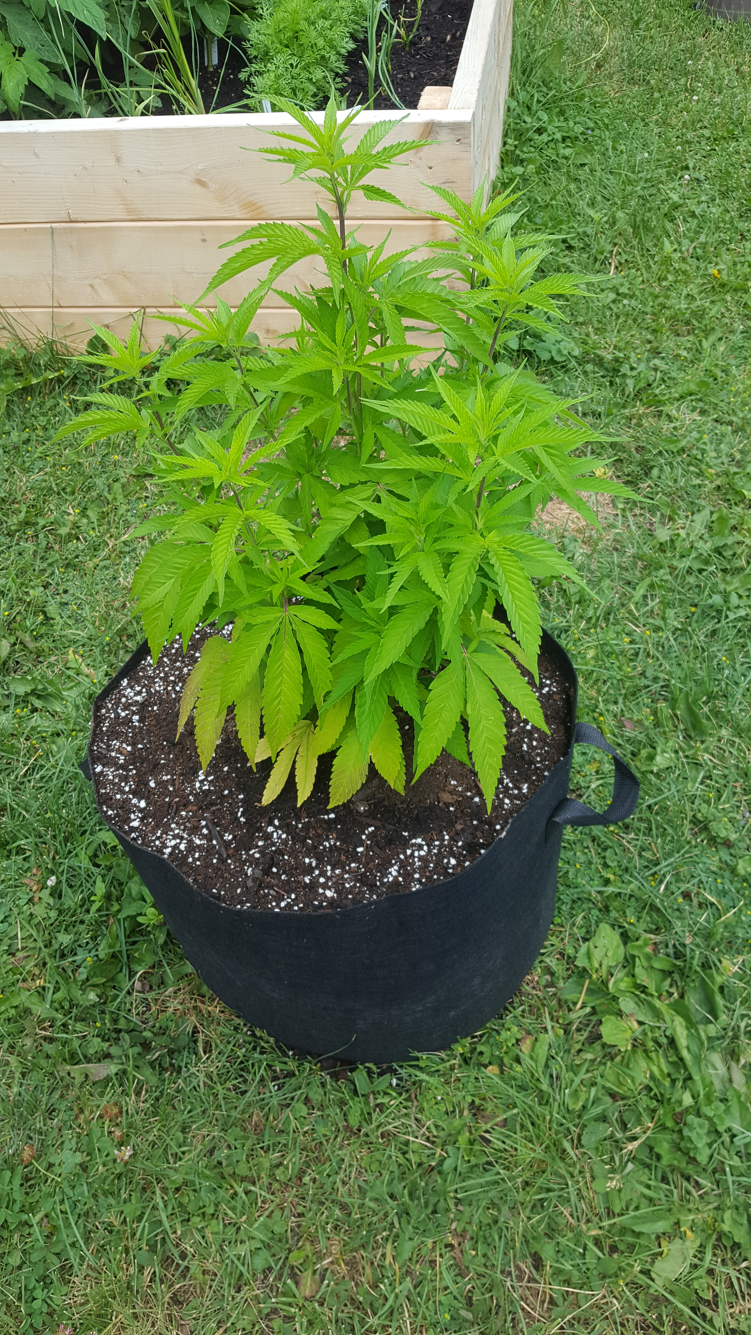I am growing a Bubble Gum Kush clone in a mixture of Triple Mix and Promix Organic Vegetable and Herb Mix contained in a fabric vivo sun 10 gal pot. I recently transplanted it from a much smaller pot plastic pot which the roots had outgrown. I haven't been feeding the plant as the Promix soil provides it with fertalizer for up to 3 months.