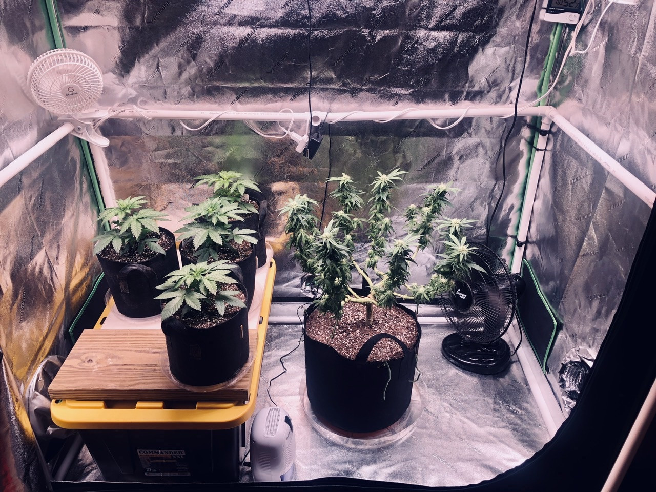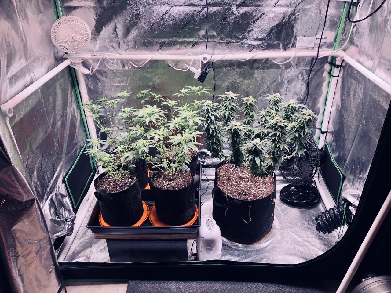 4x4 tent, Platinum LED P4-XML2, four Patio Pickers. Vegging Super Lemon Haze, Durban Poison and two Tangie x Blueberry crosses.