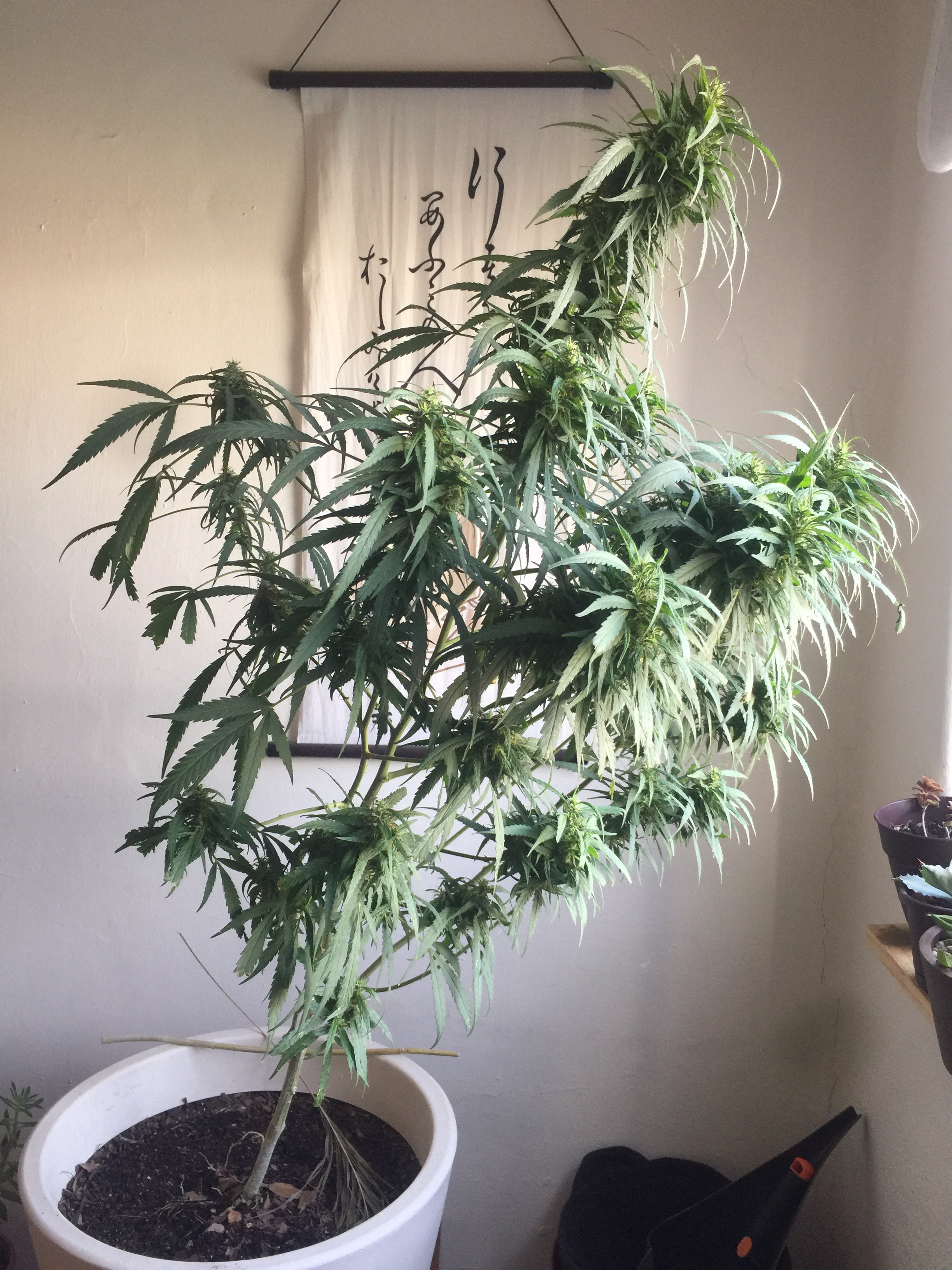 Since december last year, some seeds started growing casually. I wasn't planning to grow. Anyway, since then I allowed the plant to keep growing against, what I asume, is the normal cicle that goes from summer (more light) to winter (less light). As you will see in the photos is indoors, receiving just the outdoor light, and since three months ago, I kept feeding it with the Fox Farm nutrients combo.