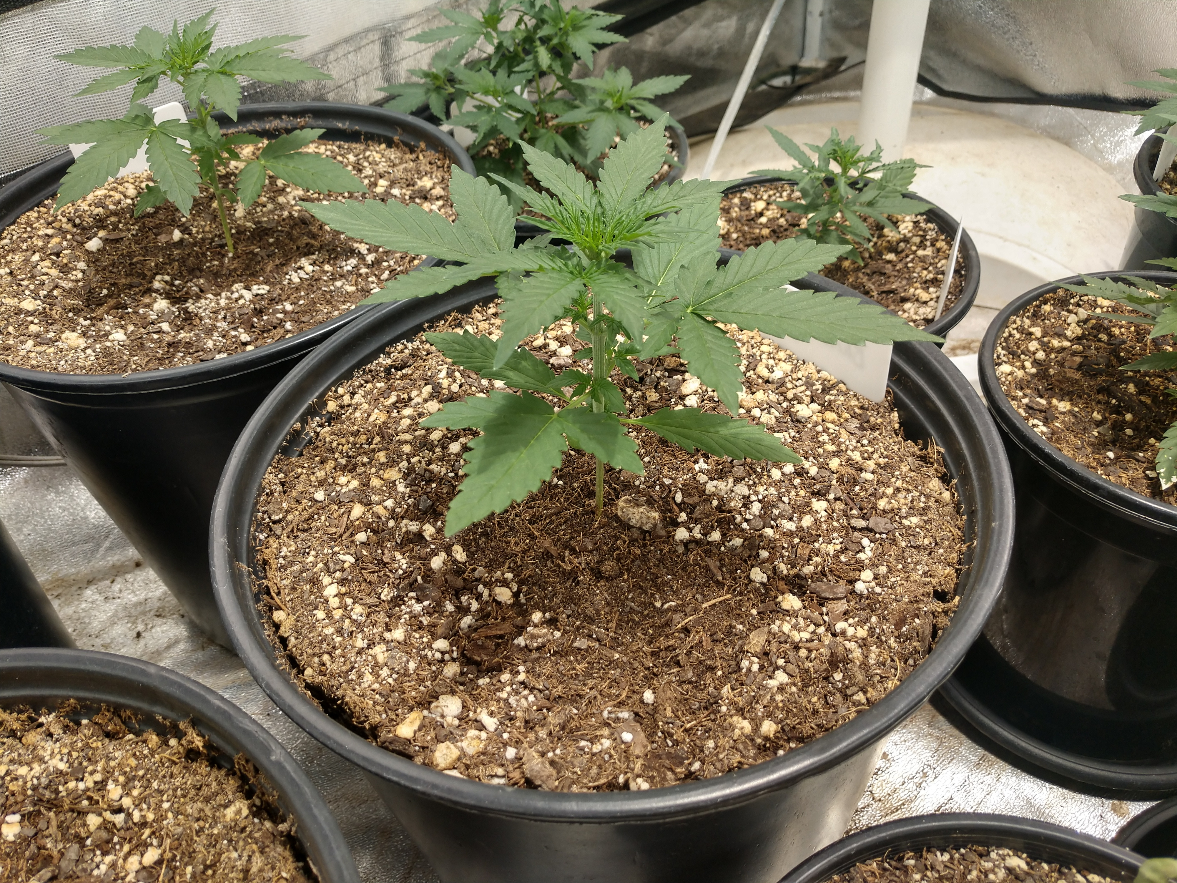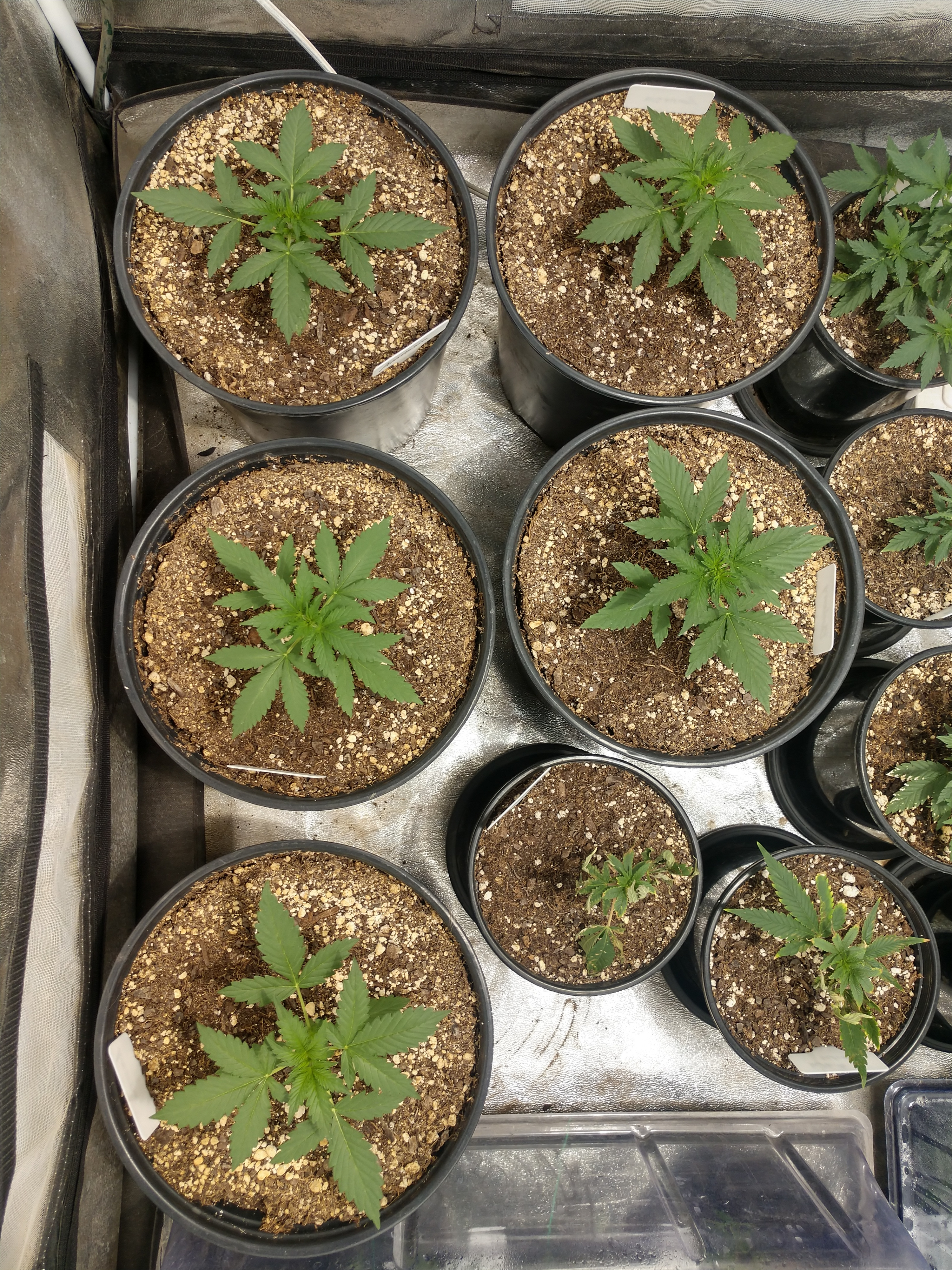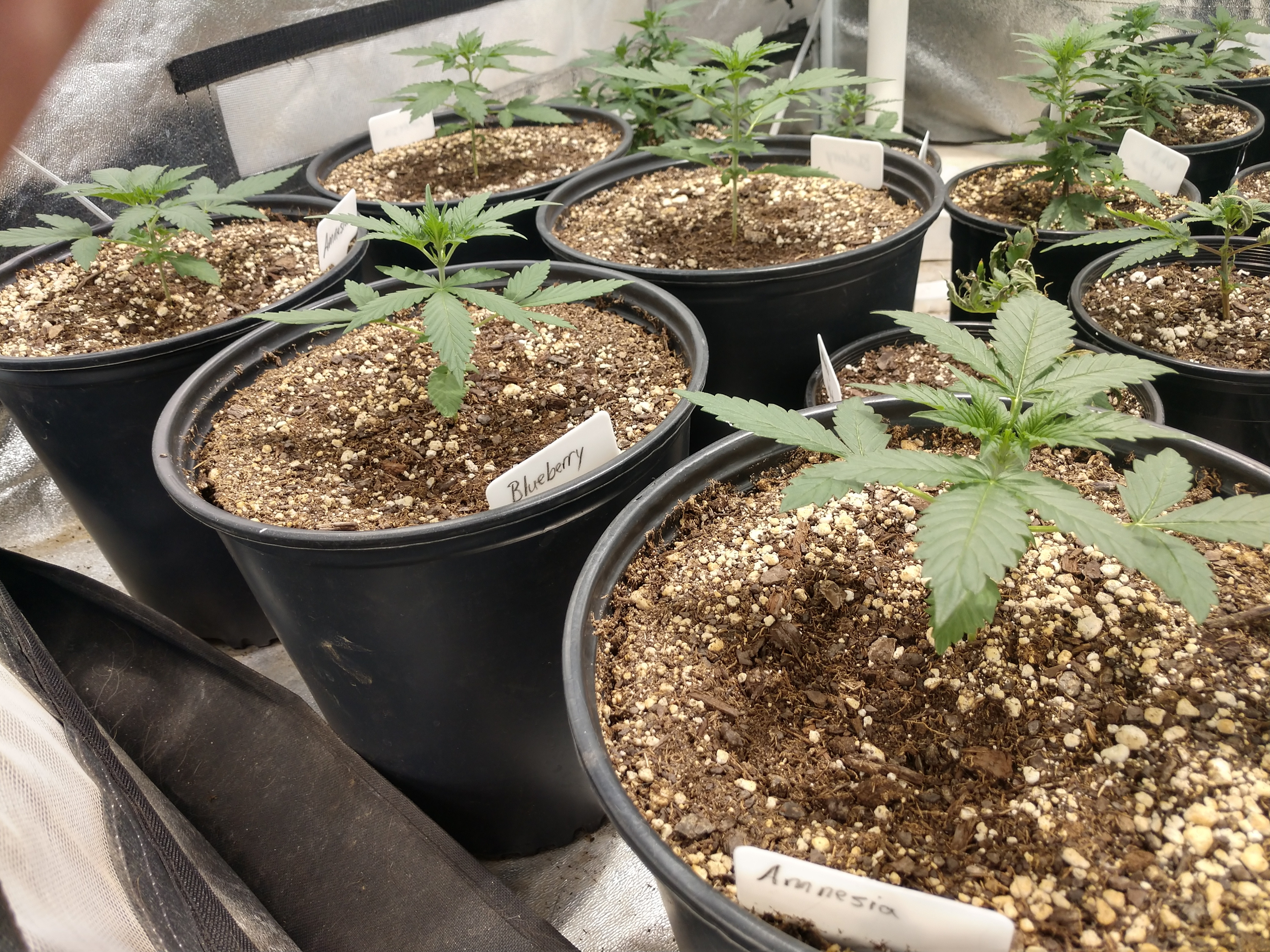 So since I'm new to these I'm going to ask you guys. My autos are on day 17 from sprout. I'm just curious if they look like they're right on track or if they're a little small for their age? They look dry I know but they're not, and today is watering day. One of the Blueberry didn't make it, unfortunately. Oh well, still have 2 Blueberry and 3 Amnesia so I'm good. Going to be topping soon and that will be be my training. Was trying to go just above the fifth node so probably the next 2-3 days. What do you guys think? Ignore the clones, that's the next round to go in my big tent. They will look better when I clean them up.