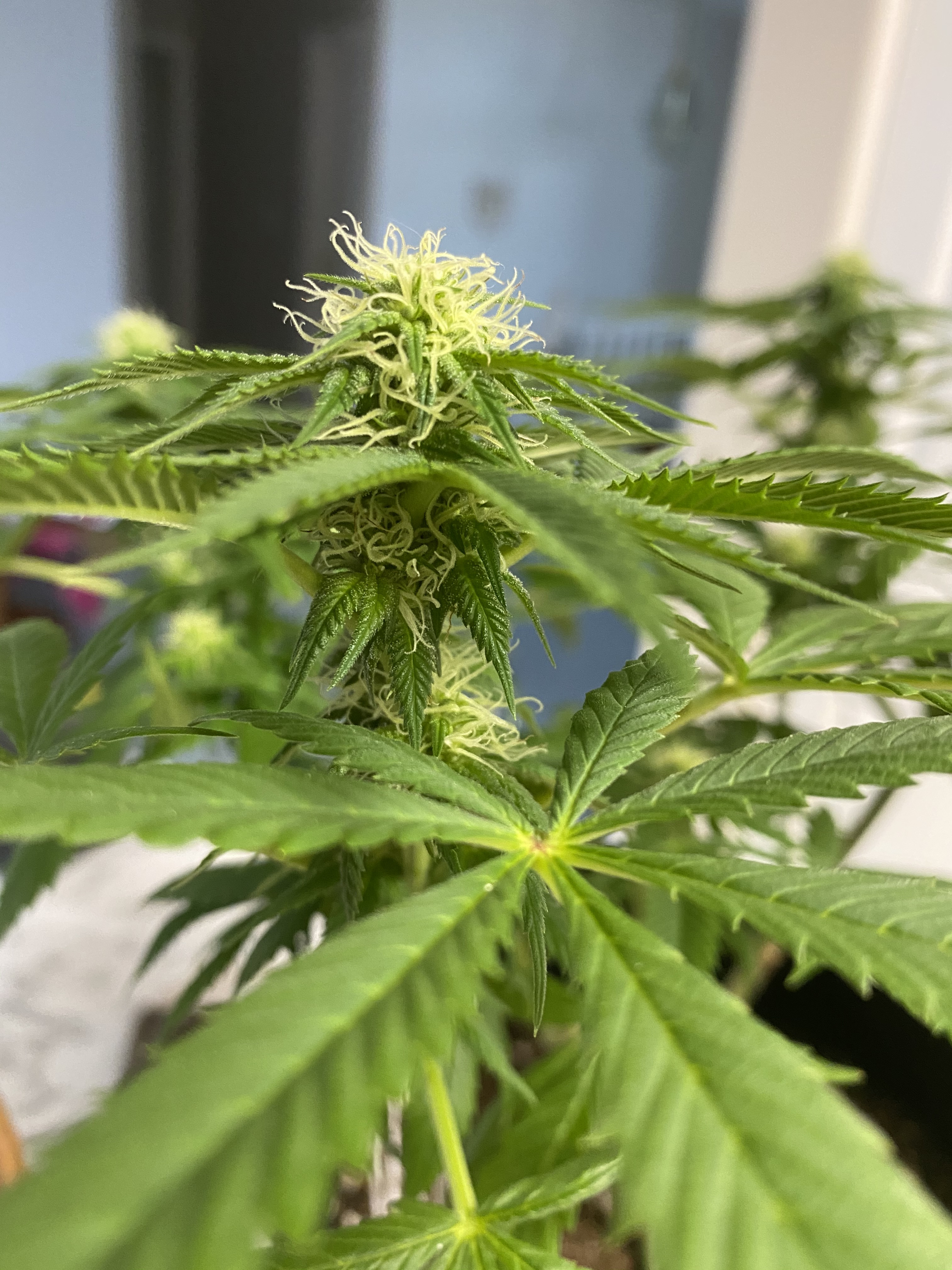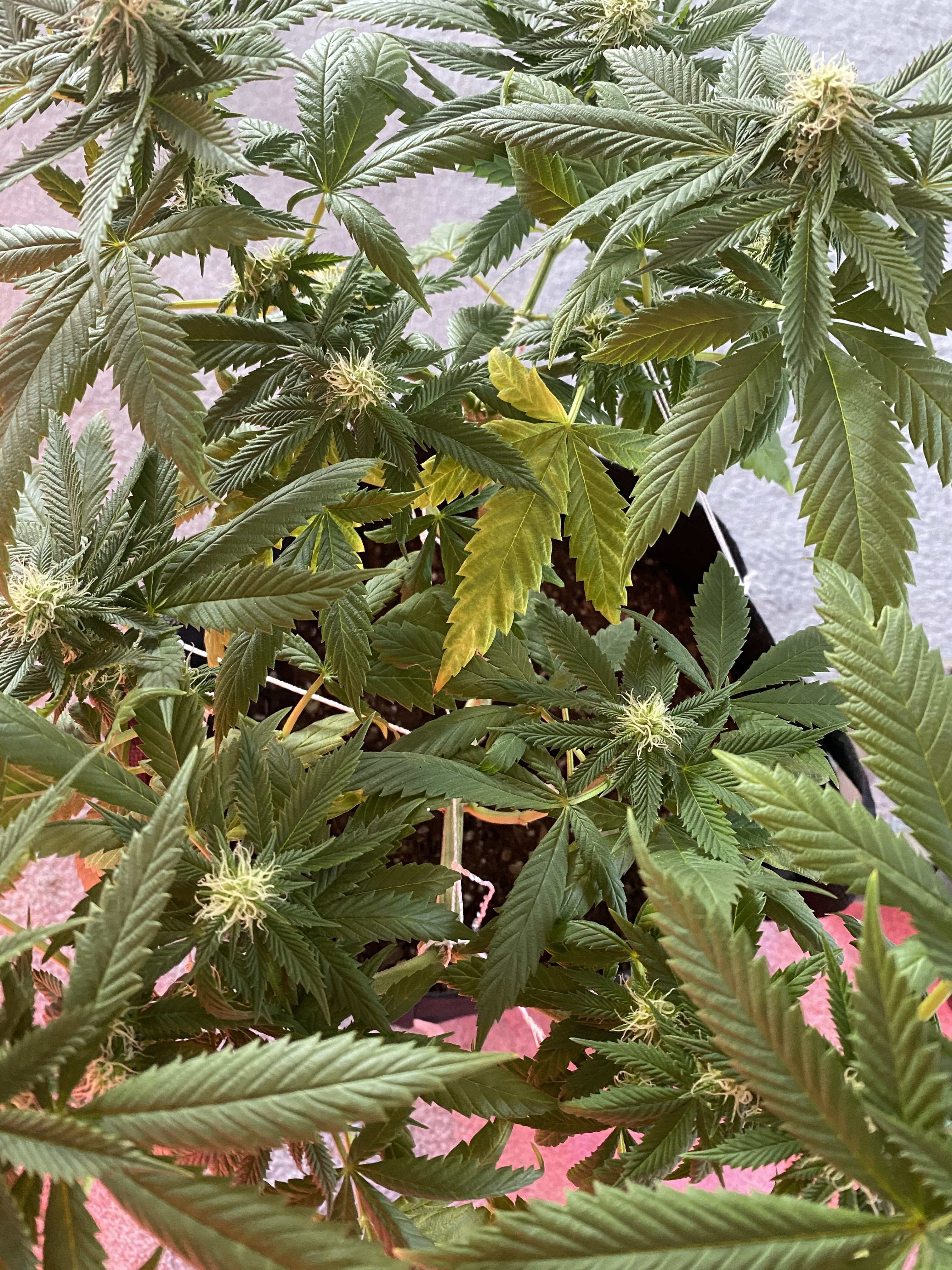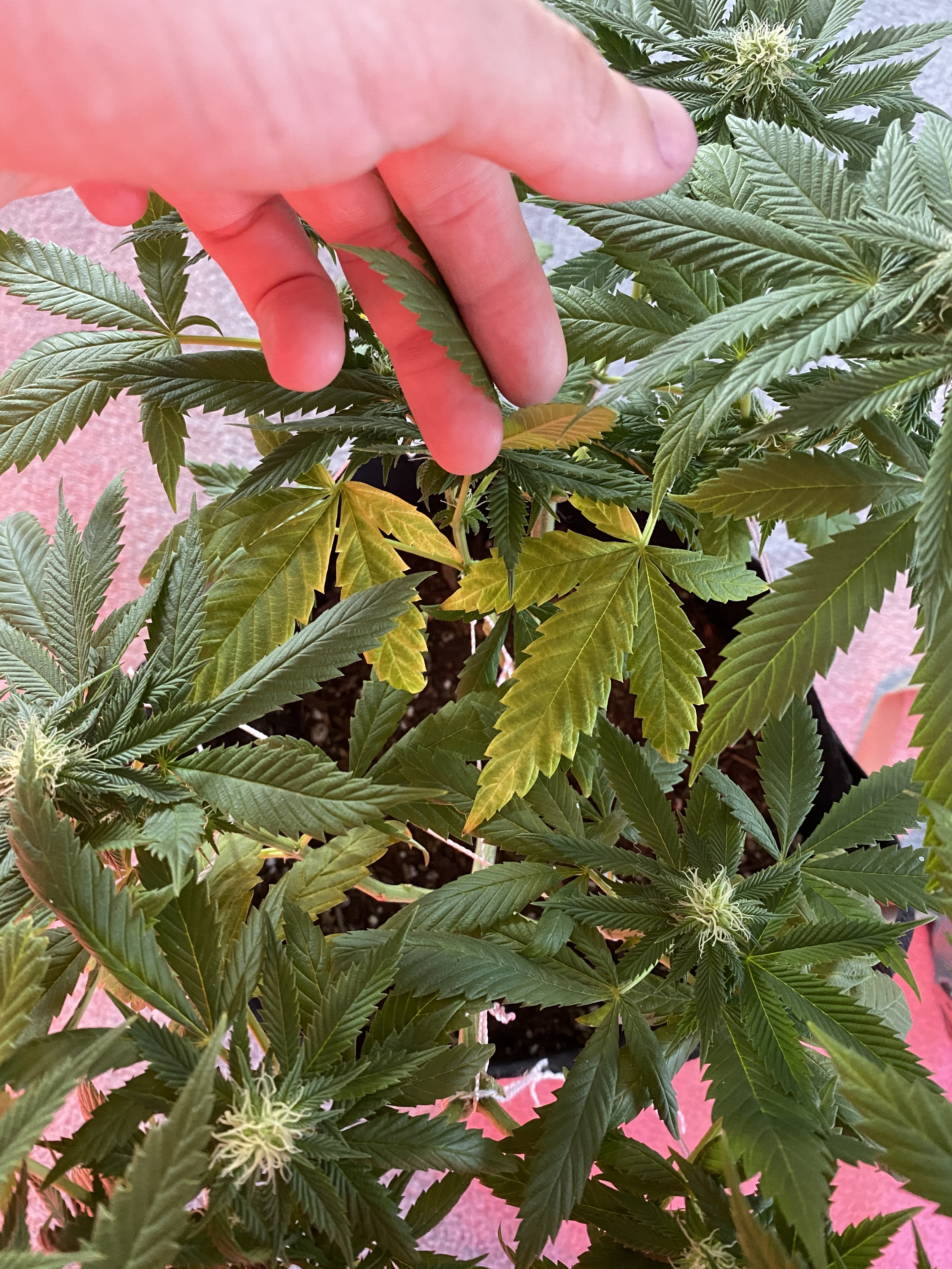 First time grower here and only growing one plant inside with soil. I've grown this plant from a seed, found it in some bud I bought from the local dispensary. My plant is in a cloth 3 gallon pot with perlite and non-miracle gro organic soil. I've never had any problems with the plant until now; we're in week 4 of flower and literally overnight a few of the bottom leaves turned pretty yellow. I thought it was nitrogen so i put some nutes in the soil during its next watering and nothing changed. I removed the leaves and the yellowing is going up the plant to the next lowest leaves. Maybe my roots aren't getting enough oxygen? I'm looking for any and all suggestions as to what I could do! I have attached a few pictures of the few yellow leaves and a droopy fan leaf.