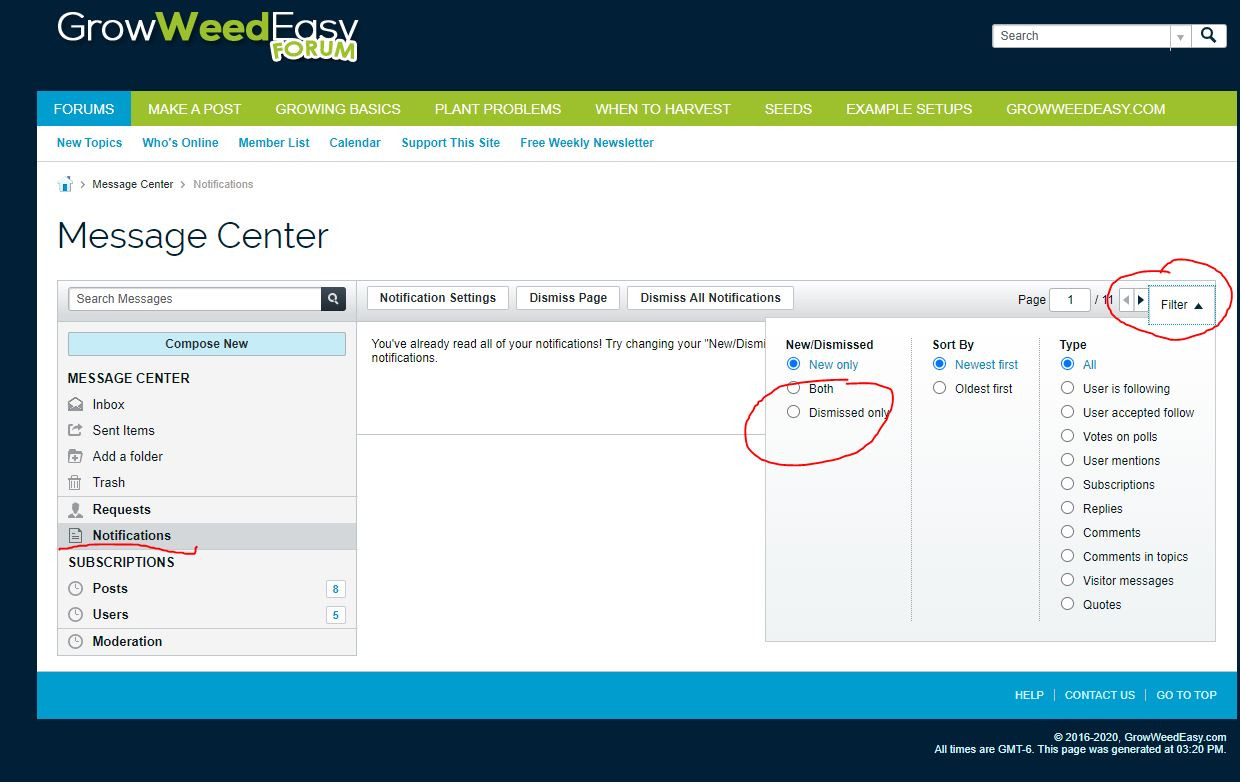 If you are on PC like me, you click "Messages" and then "Go to message center". Then on the right side there should be the "Message Center". Find "Notifications" and click. Then on the left side there should be an downward triangle with "Filter" next to it. Click and then click radio button that appiles ("both" shows you read and unread notifications ect)