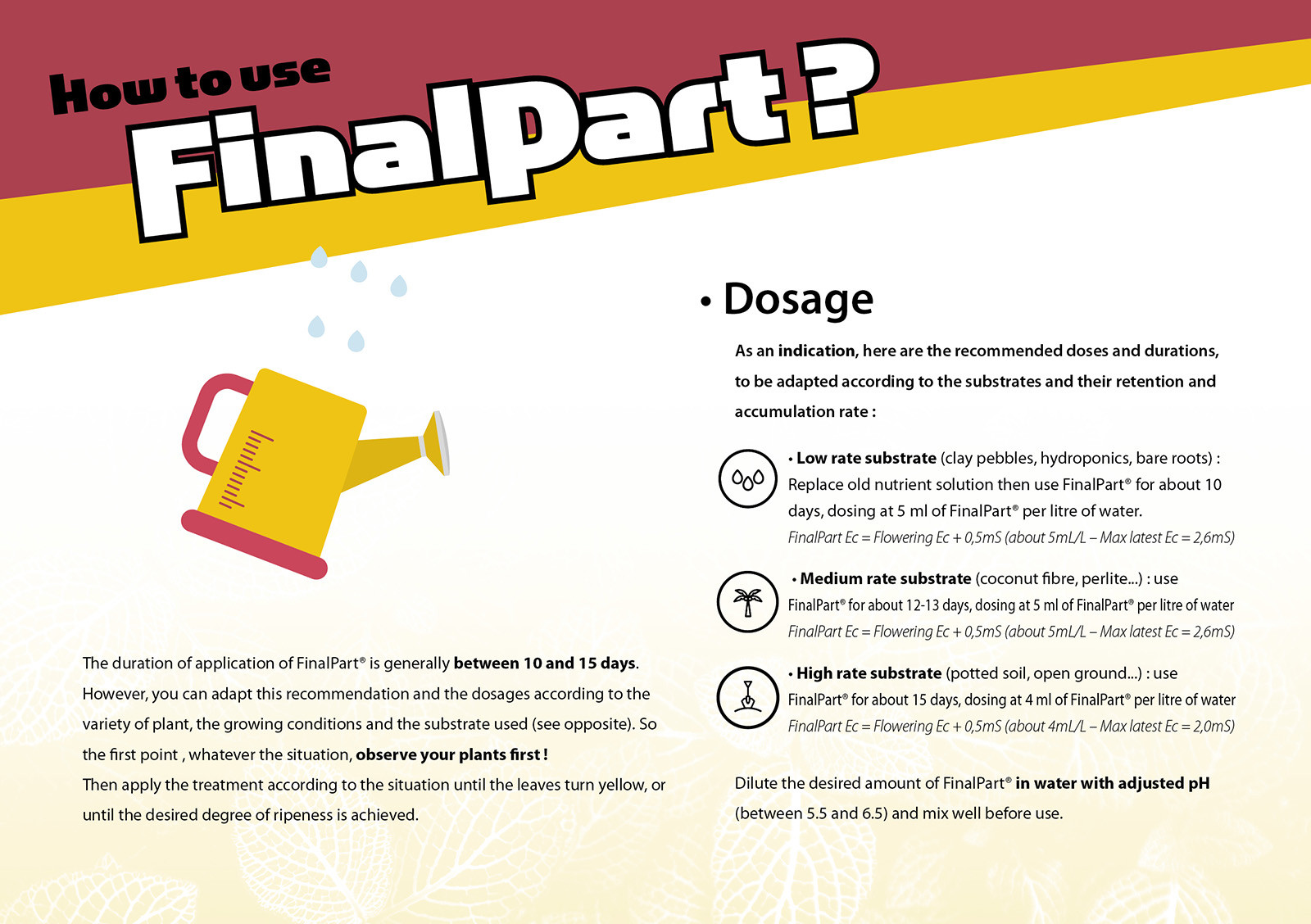 oh thats different than US. maybe check https://www.eurohydro.com/application-charts.html instead for feedcharts or there is this https://www.eurohydro.com/quick-guide-finalpart . I have never used that product so i cant comment on it but most ripening is within the last week or two. Read the link i sent you for Final Part as it tells you how much, and when and specifically not to use with other nutes.