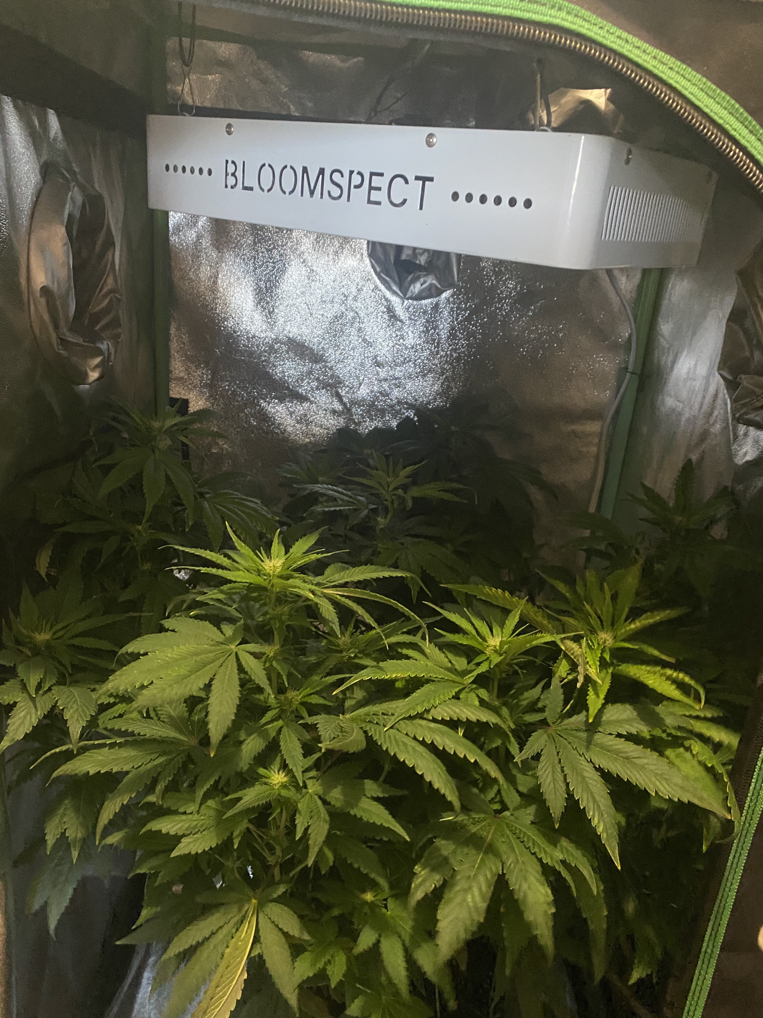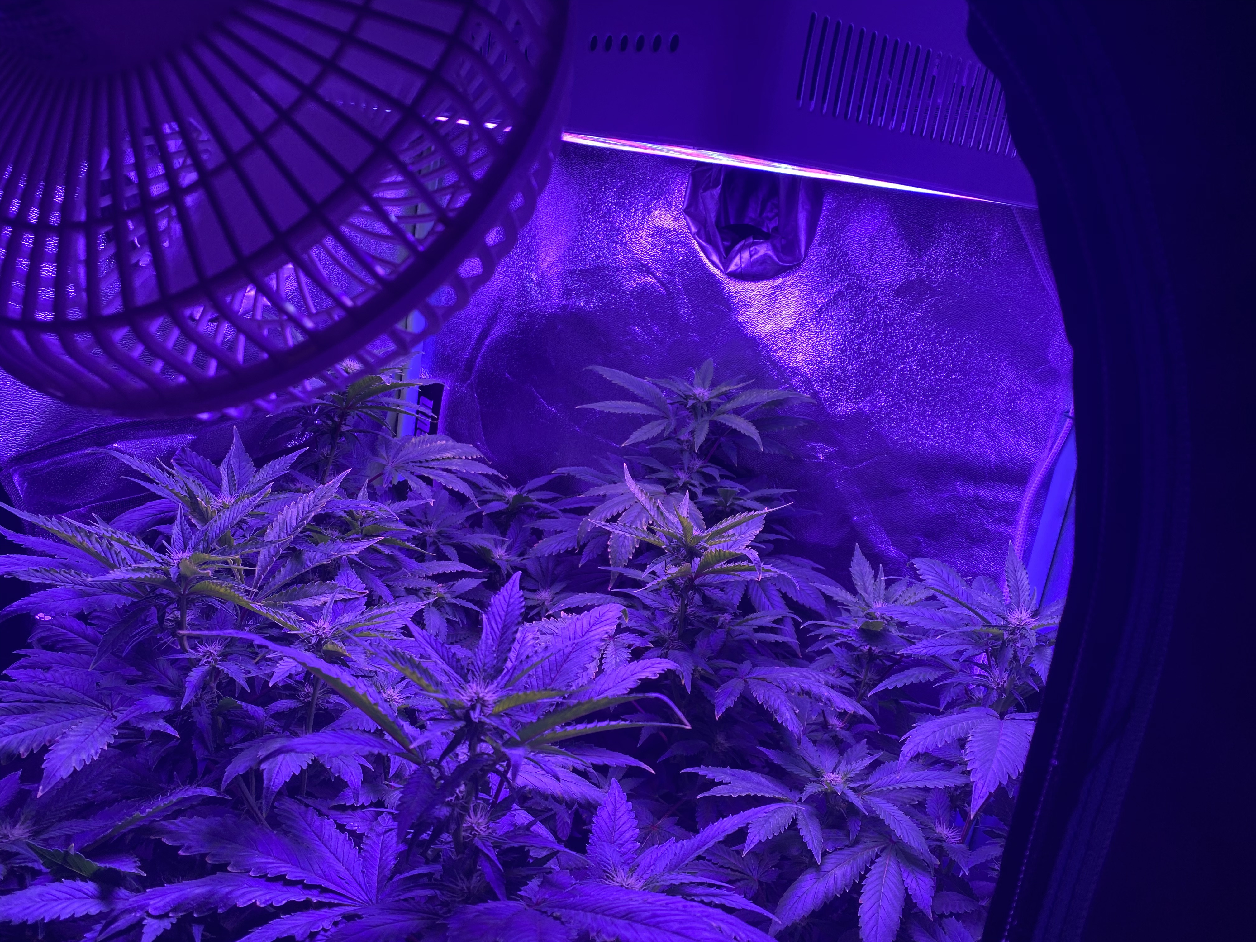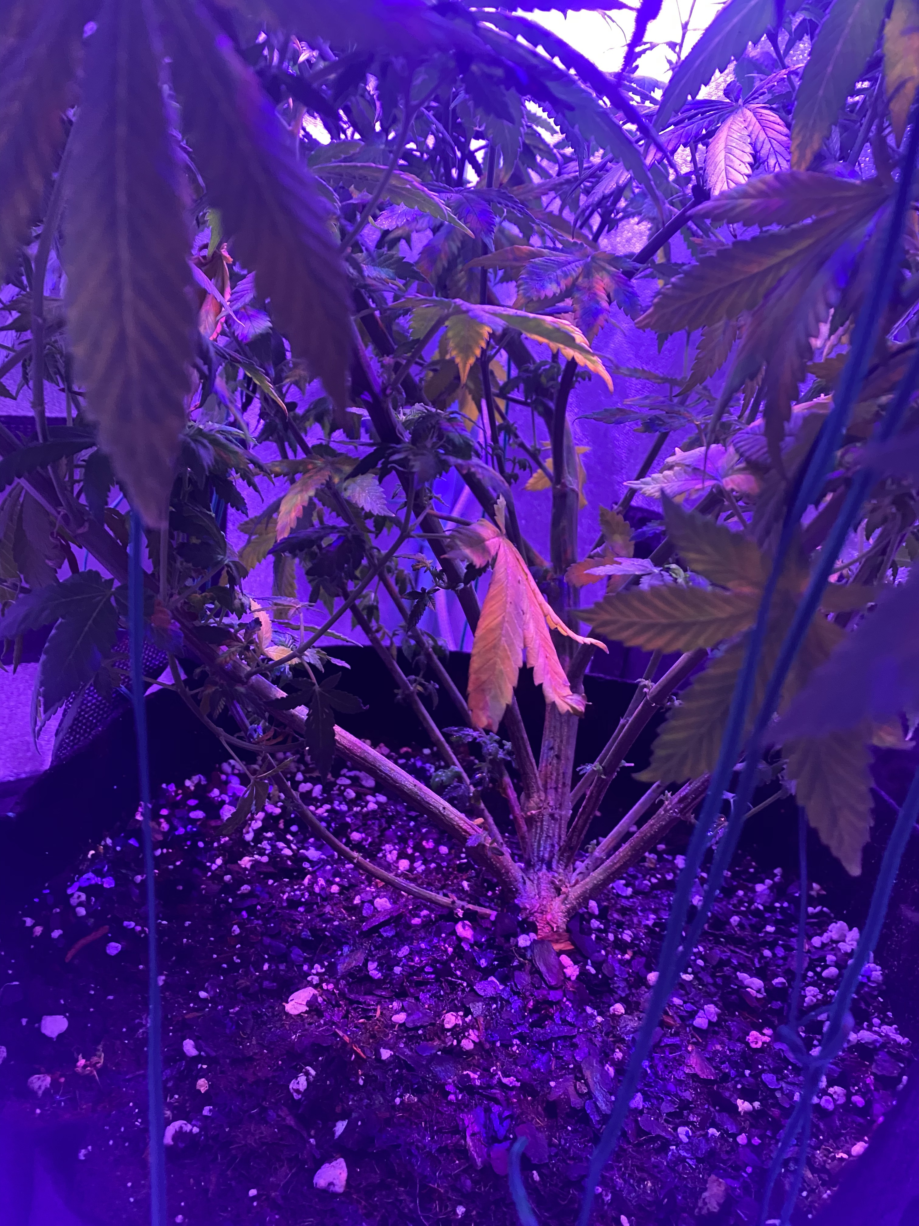 1) That she is getting too close to the LED light. As you can see a few of the top leaves have turned yellow, have some browning, and I’m running out of tent room, and would welcome any ideas on how to handle this. As of now, I continue to lst her, and then when it gets hot, I’ll put ice cubes near the base