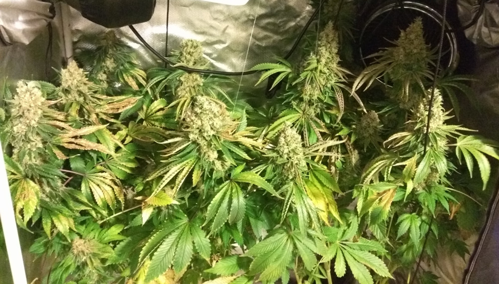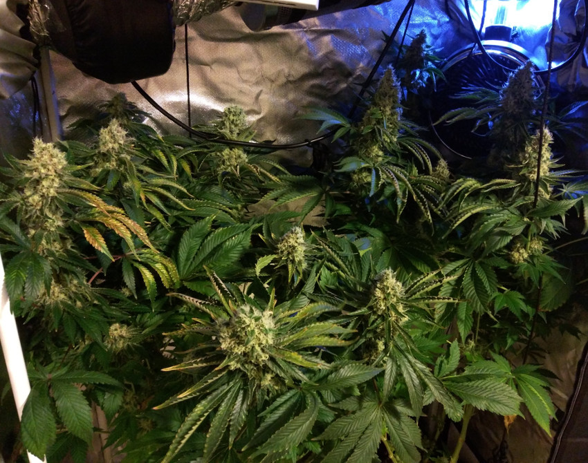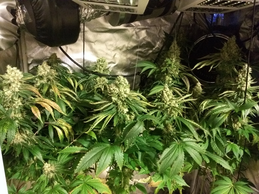 Am beginning to see hints of light issues with the top leaves nearest the lights - height is maxed out in there, and I have no room to bring the lights up further. I've been bending the main colas outward as I can to try and keep them out of the brightest areas in the centre - leaving that to the fan leaves further down the plant.