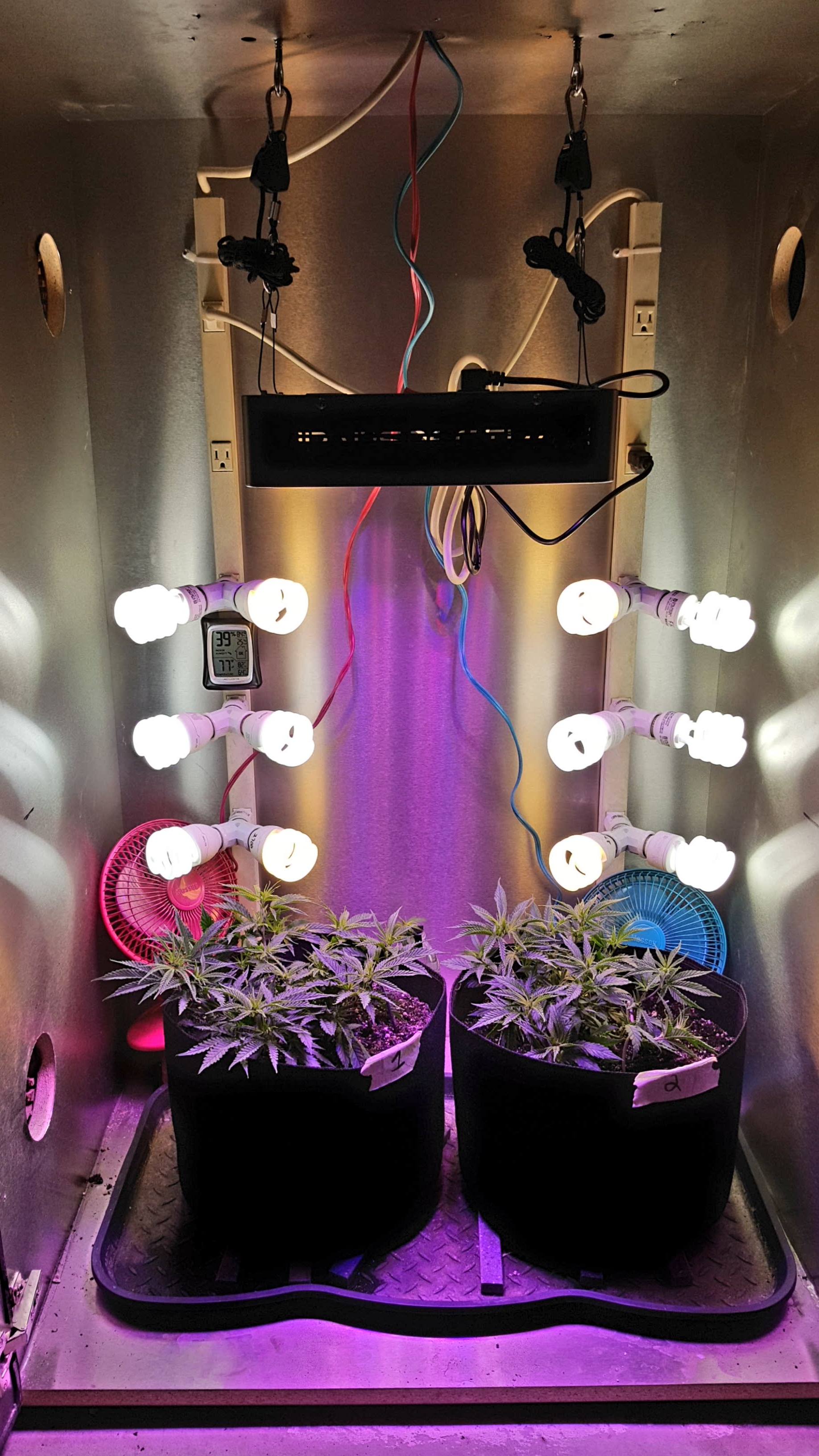 First day running. I did a little lst training and branches turned back up in an hour. Much faster than they did with cfls. Seems pretty bright not as pink as it looked in the pictures on amazon. I figure I will supplement with 2700k cfls during flower if needed. I'll update how they are growing in a few days. Here is a pic looking down at them.