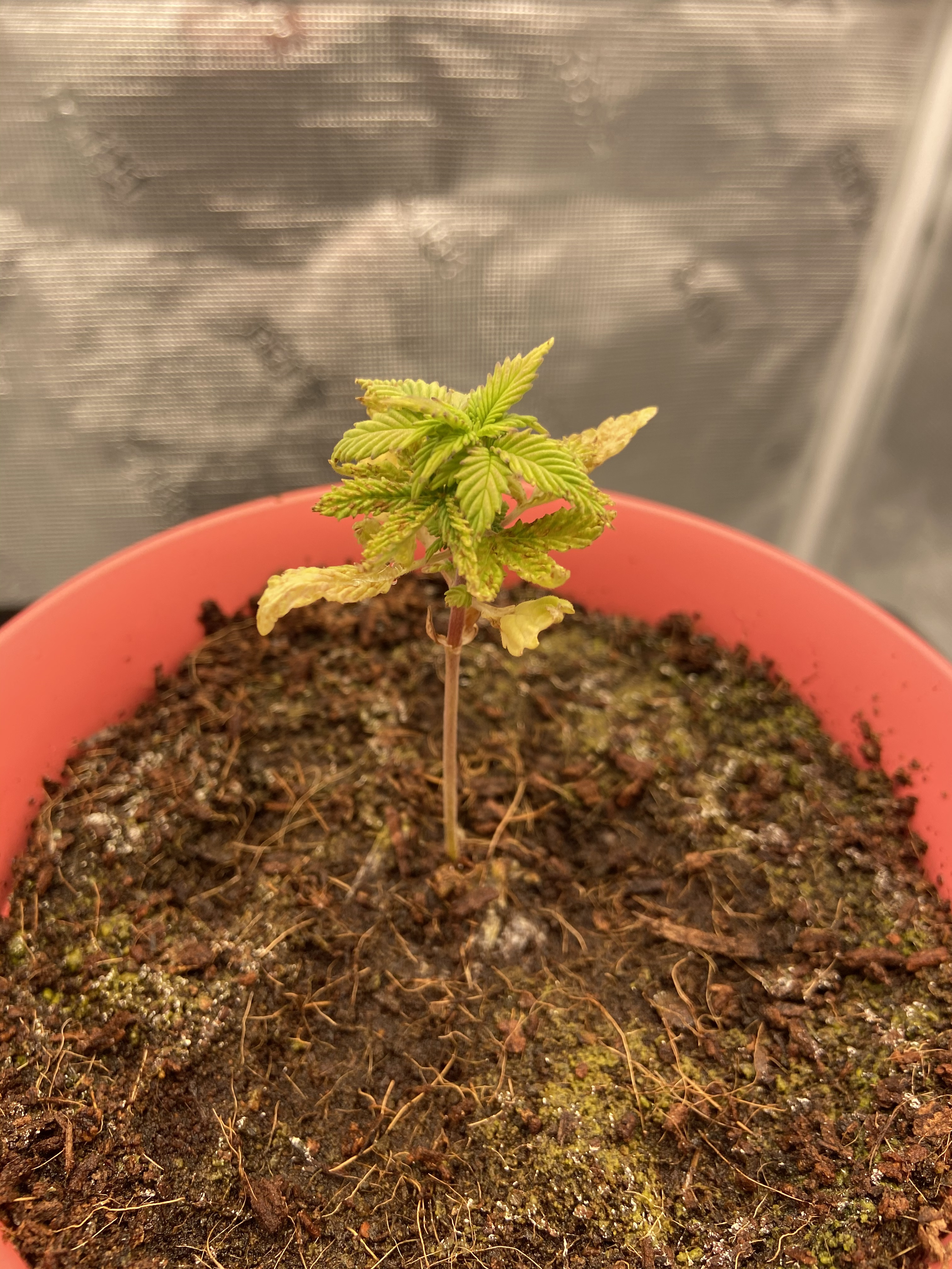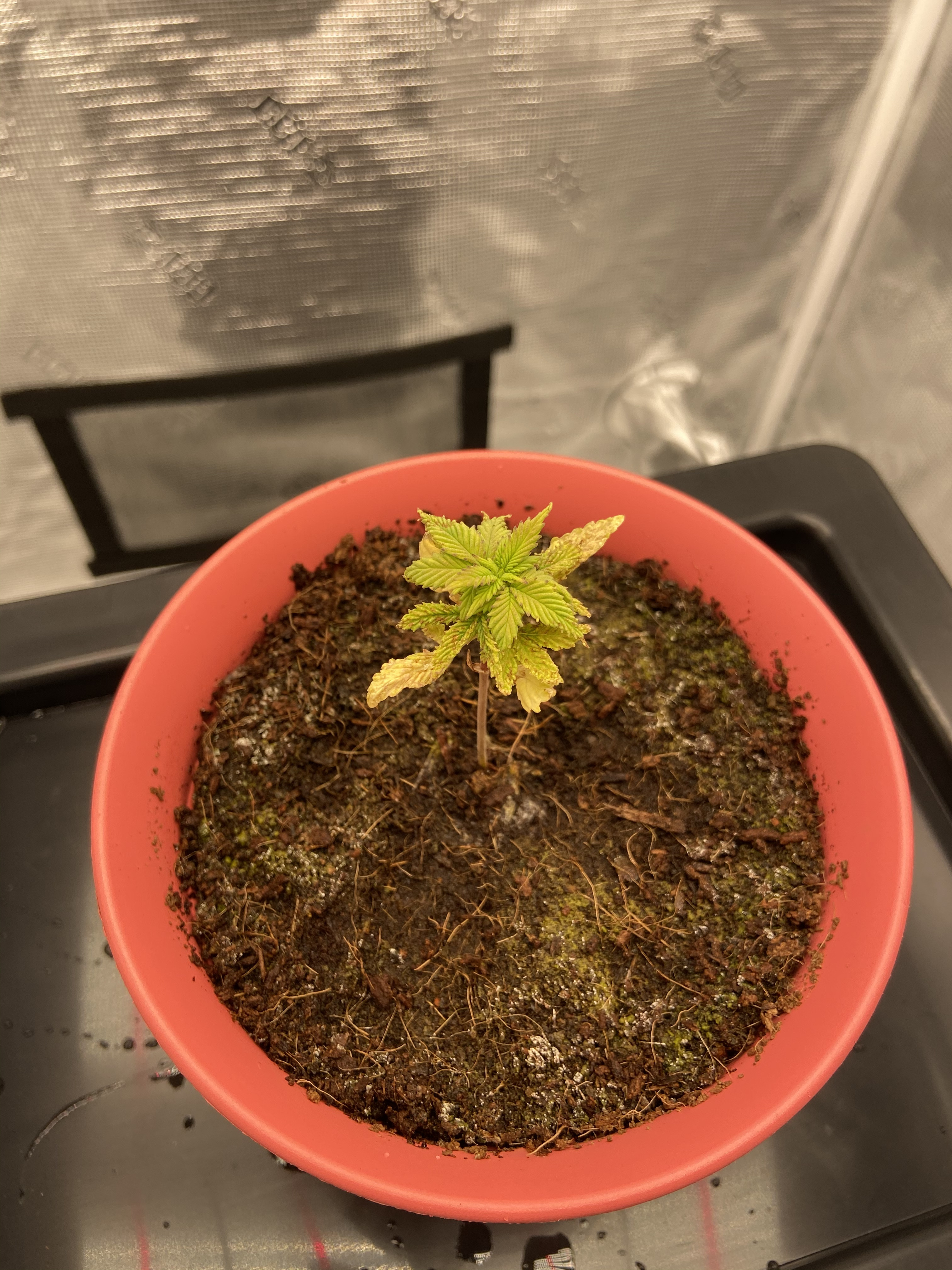 Hi y’all! Got this little seedling going and it was going fine for the first week. Now it looks like it stopped growing and it’s got some brown stuff on the leaves.