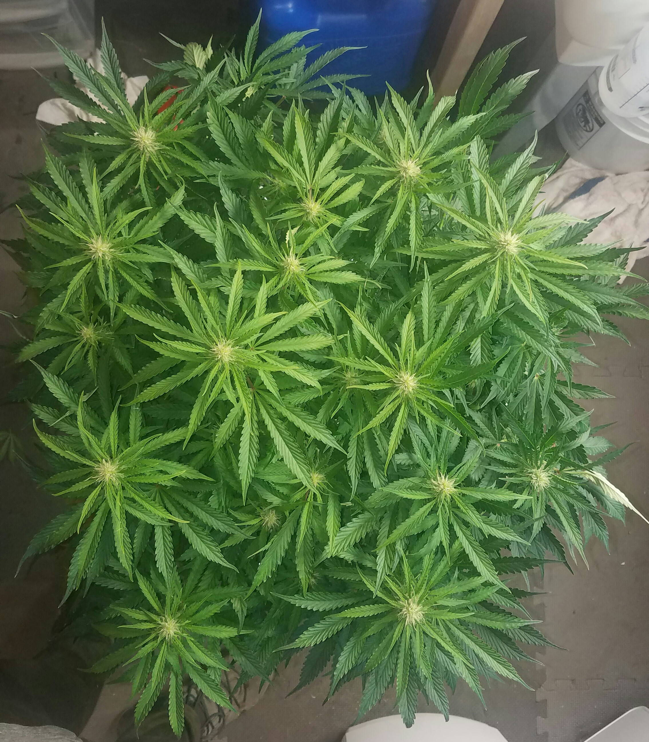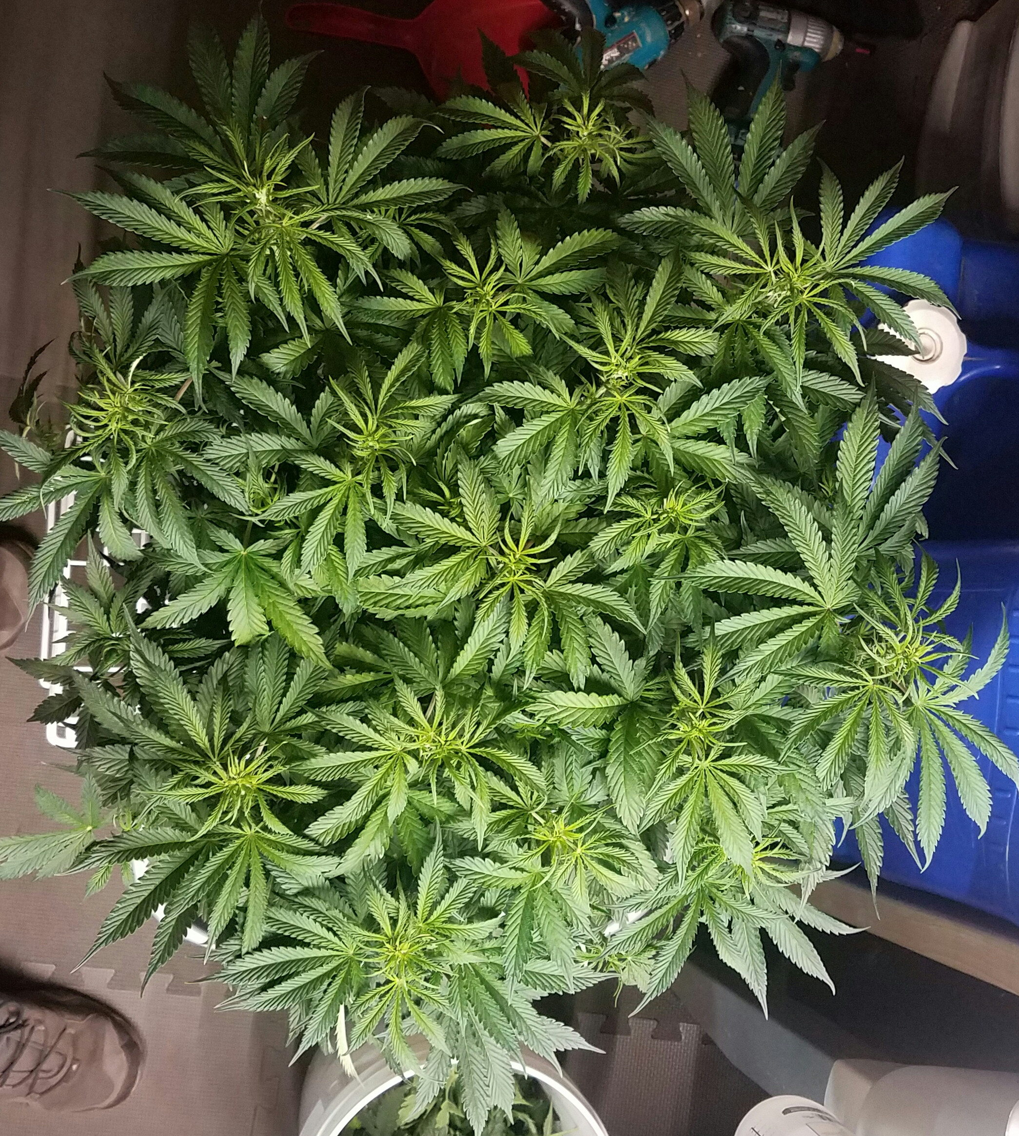 Took about 30 leaves off the 3 plant I didn't cut yesterday, I stand over my plants and look down into them to remove leaf, next I worked a little bit underneath and lollipop each of them to remove some of those annoying little branches in the way of watering. I'll wait two days and then do all four of them again a little more.